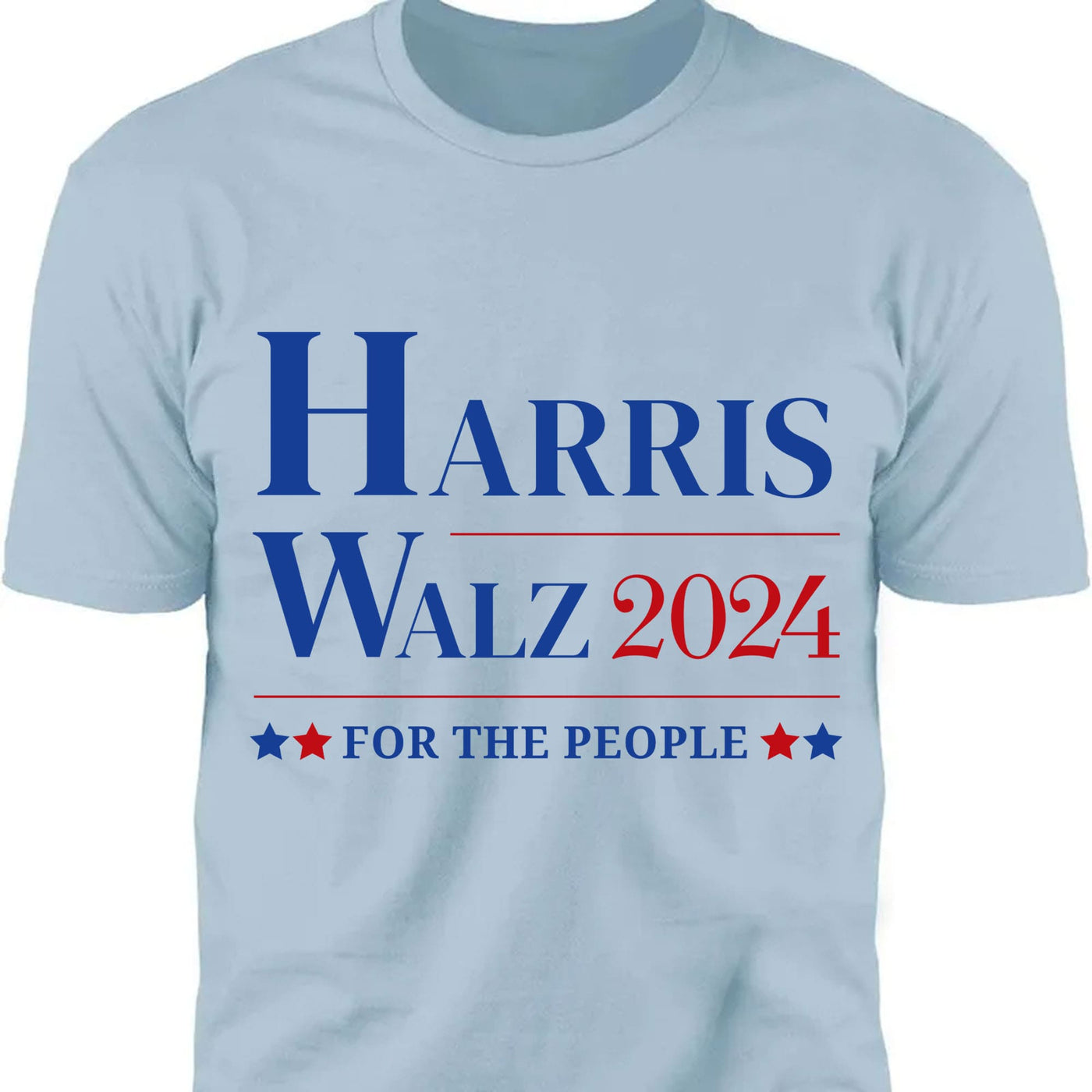 The shirt features the bold text "Harris Walz 2024," with "Harris Walz" displayed in a dark blue color, emphasizing strength and unity, while "2024" stands out in a striking red sans-serif font, symbolizing a dynamic and forward-looking campaign. Below this main text, the phrase "for the people" is elegantly framed by two stars on each side—one red and one blue—representing a commitment to all Americans. This design combines patriotic colors with a modern, bold statement, making it perfect for supporters of the Harris Walz campaign.