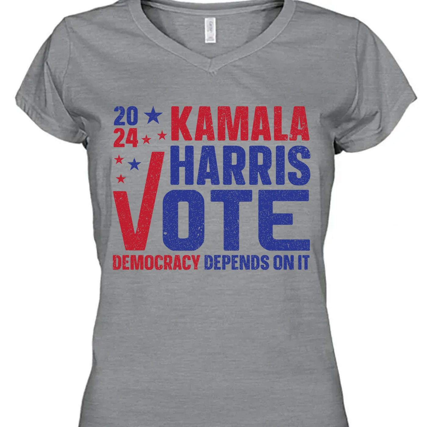 The design includes stars and the year 2024, indicating it's related to the upcoming U.S. presidential election. The text is arranged in a bold, eye-catching layout with "VOTE" being the largest word. The colors red and blue are used, which are typically associated with American politics. The shirt appears to be promoting Kamala Harris as a candidate for the 2024 election, emphasizing the importance of voting and framing it as crucial for democracy.