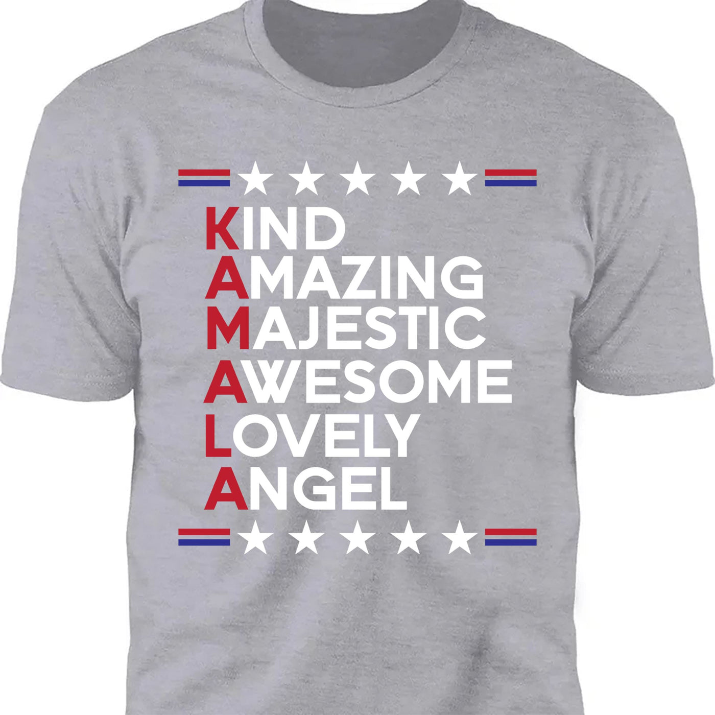 The t-shirt design prominently features the acronym "KAMALA" vertically in bold red letters, with each letter representing a positive attribute: Kind, Amazing, Majestic, Awesome, Lovely, Angel, the words are arranged in a clean, white font. Above and below the text, a row of five white stars adds a patriotic touch, flanked by a red and blue line on each side, enhancing the overall design with a sense of unity and pride. This shirt captures a bold and empowering tribute, celebrating Kamala Harris with impactful and uplifting words.