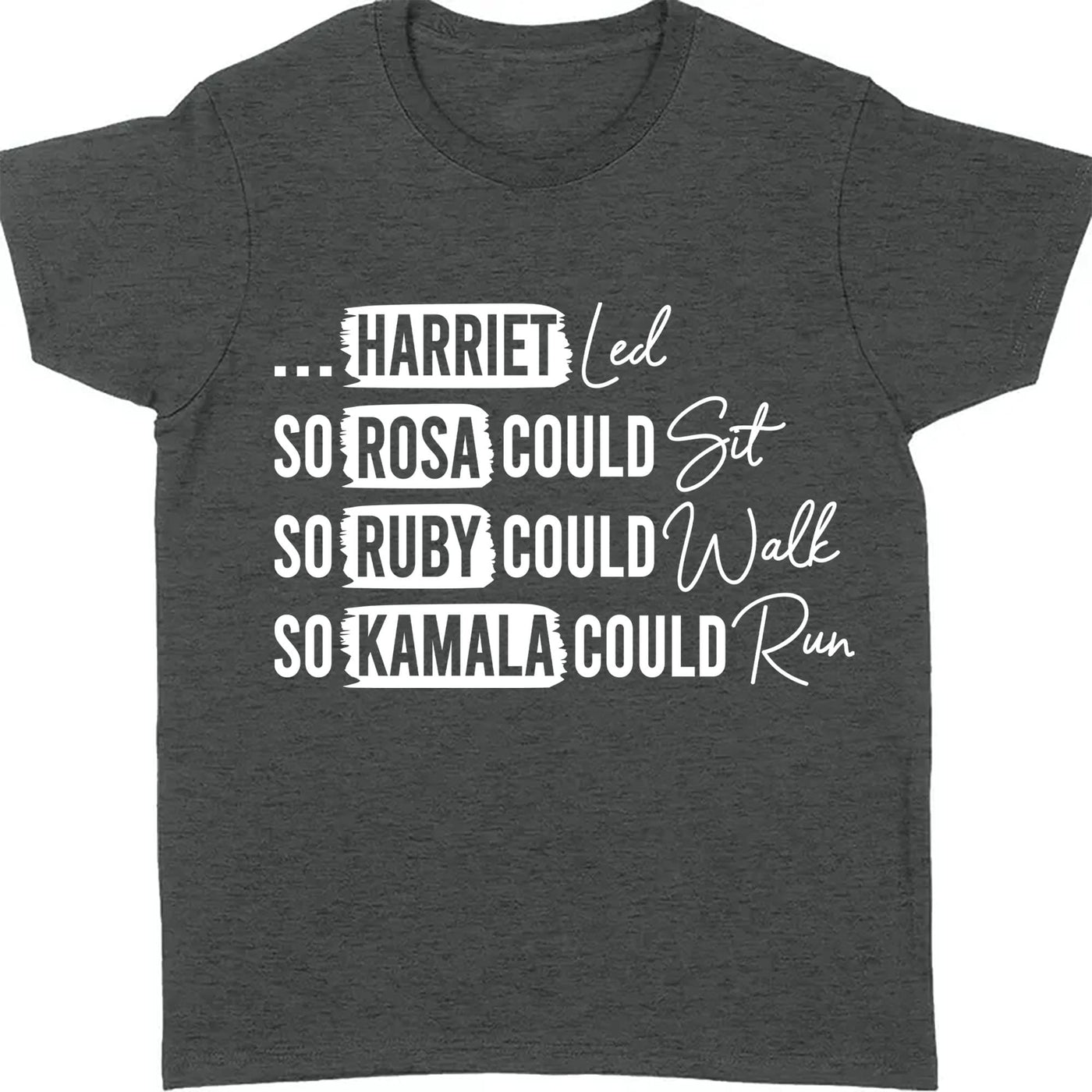 This powerful t-shirt design honors the legacy of trailblazing Black women who have paved the way for future generations. The design features the bold text:"...HARRIET Led, SO ROSA COULD Sit, SO RUBY COULD Walk, SO KAMALA COULD Run". Each statement is visually emphasized with the words "Led," "Sit," "Walk," and "Run" in a flowing script, creating a dynamic contrast with the bold, all-caps text. The layout highlights Harriet Tubman, Rosa Parks, Ruby Bridges, and Kamala Harris, symbolizing their courage and leadership throughout history.