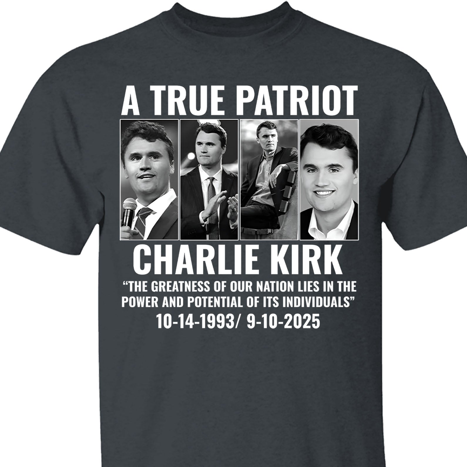 Pay tribute to the life and legacy of Charlie Kirk with this memorial shirt. Featuring the words “A True Patriot” above his name and four portraits capturing his presence, this design honors his memory and impact. More than just a shirt, it serves as a heartfelt farewell — a way to remember, reflect, and carry forward the values he stood for.