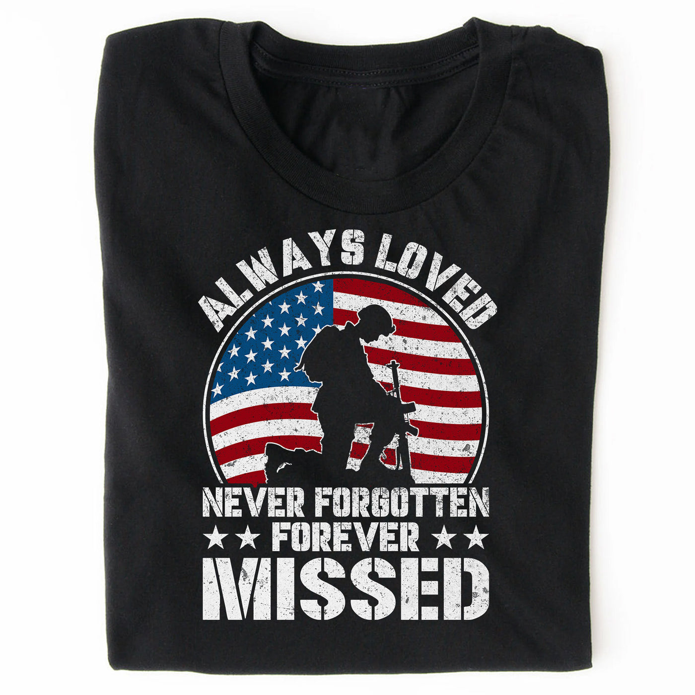 Honor the brave with this heartfelt Memorial Tribute T-Shirt, featuring a powerful silhouette of a soldier kneeling before a battlefield cross, backed by the American flag. With distressed-style text reading “Always Loved, Never Forgotten, Forever Missed,” this shirt is a meaningful tribute to fallen heroes. Whether for Memorial Day, Veterans Day, or in remembrance of a loved one, this tee speaks volumes without saying a word.
