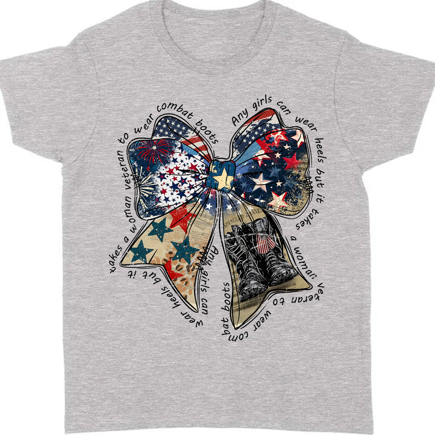 Celebrate strength, service, and style with this empowering women's T-shirt. Featuring a striking patriotic bow design filled with red, white, and blue stars, American flag elements, and military motifs, this shirt honors the powerful message: “Any girls can wear heels, but it takes a woman veteran to wear combat boots.”