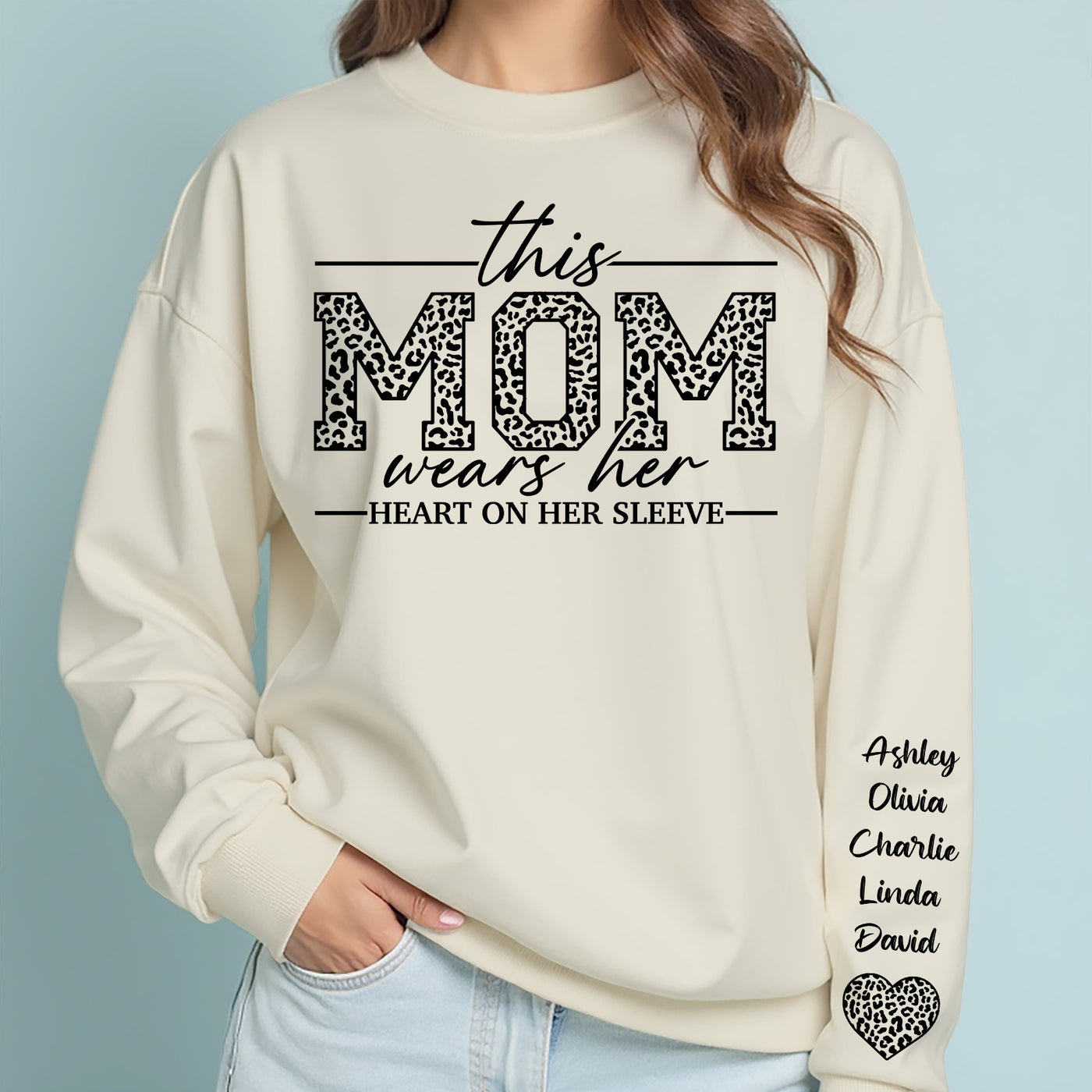 This personalized sweatshirt features the meaningful phrase “This mom wears her heart on her sleeve” printed on the front, with the option to customize kids’ names along the sleeve for a truly personal touch. Designed for comfort and everyday wear, it’s a beautiful way for moms to proudly carry their love wherever they go. Perfect as a Mother’s Day gift, birthday present, or heartfelt surprise, this custom sweater combines cozy style with deep sentiment—making it a piece she’ll cherish and wear often.