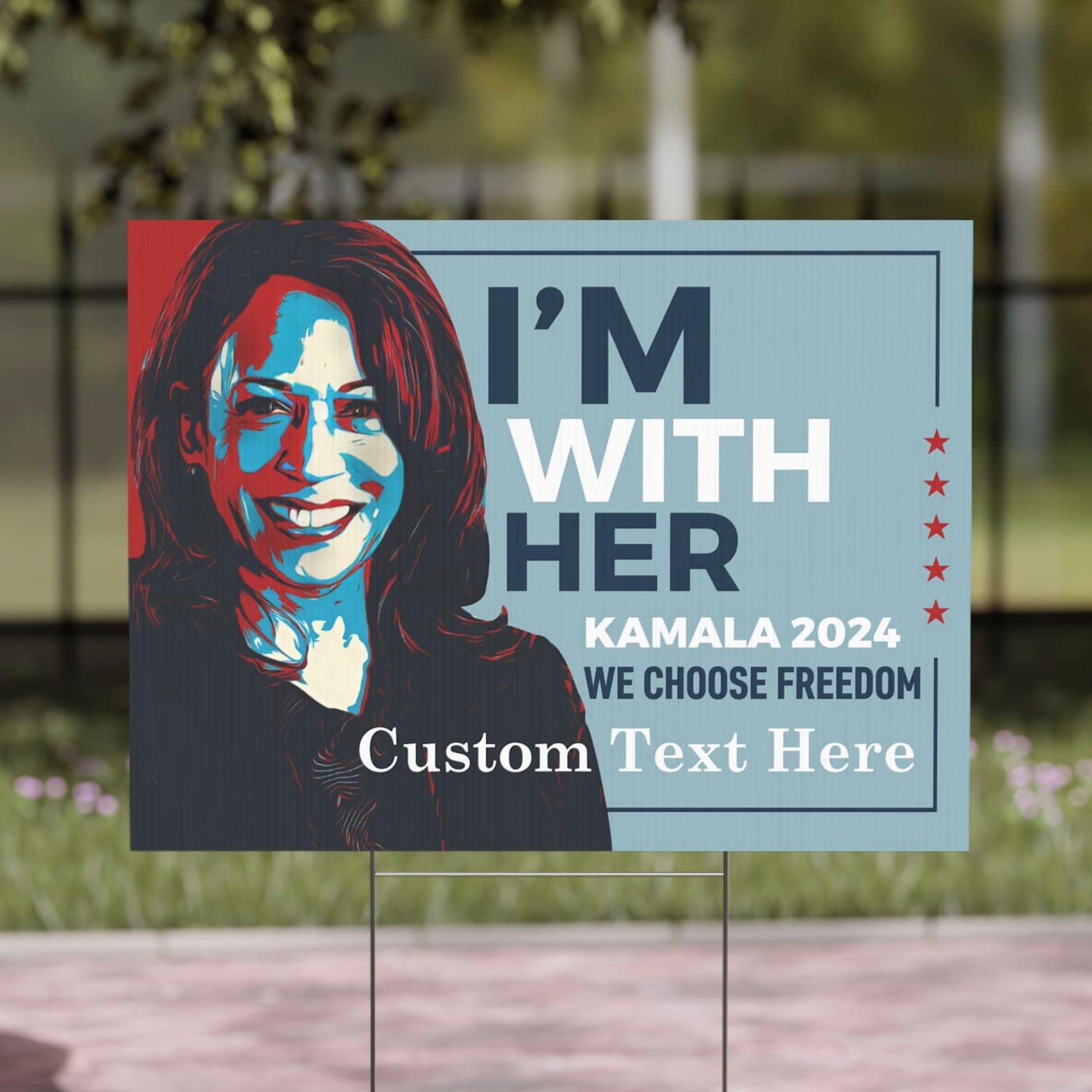 Show your support for Kamala Harris with this custom yard sign, featuring her inspiring face and the empowering words "I'm with Her." Perfect for displaying in your yard, at rallies, or during campaign events, this sign is a great way to make your voice heard. Stand with Kamala Harris and show your support for her campaign to become the next President of the United States.