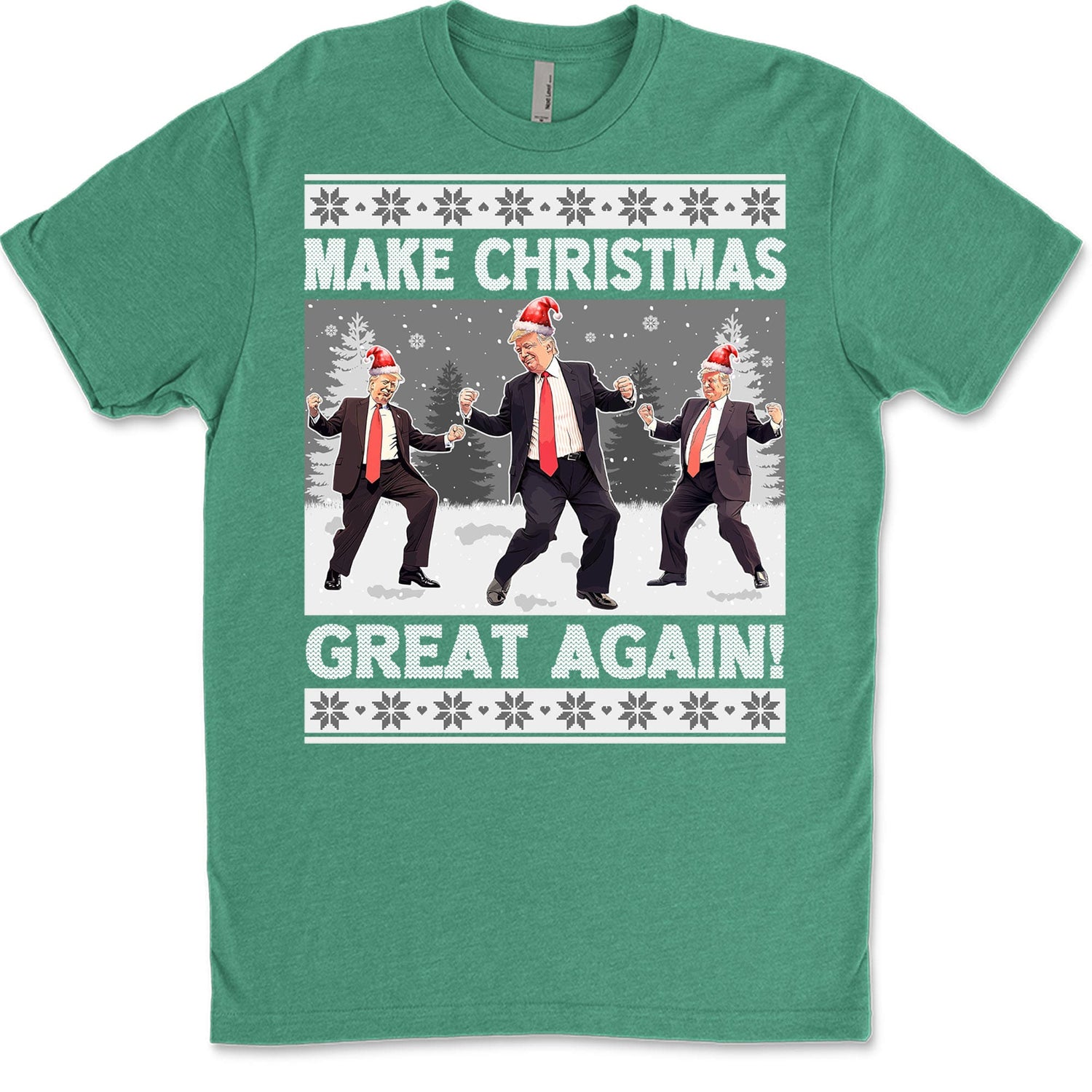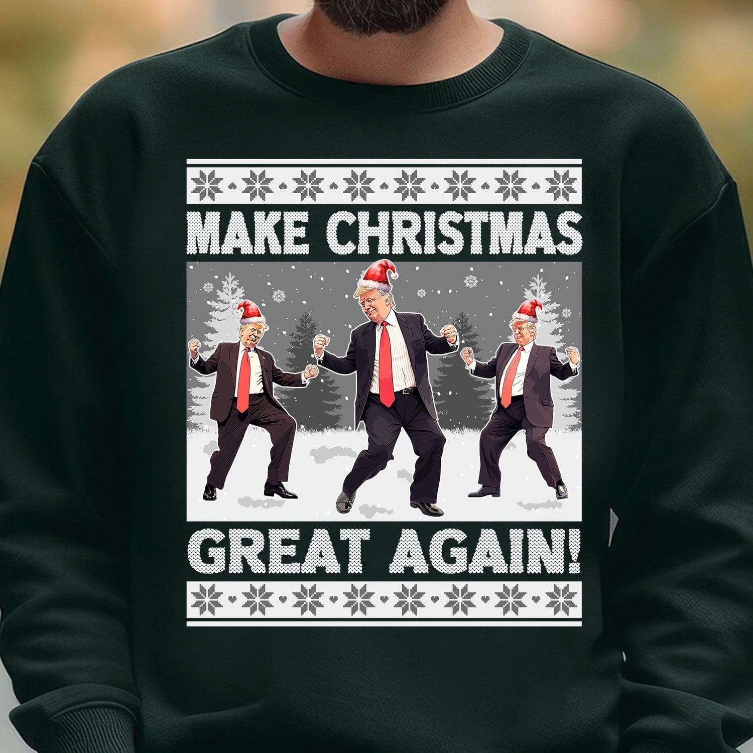 This sweatshirt design showcases a festive winter scene with Trump dancing outdoors in the snow, surrounded by Christmas trees. Above this lively image, the phrase "Make Christmas" is displayed in a classic knitting sweatshirt style, adding a cozy, holiday feel. Below the scene, the words "Great Again" are presented in the same charming knitted style, tying the entire design together with a playful nod to both the holiday season and a familiar slogan.