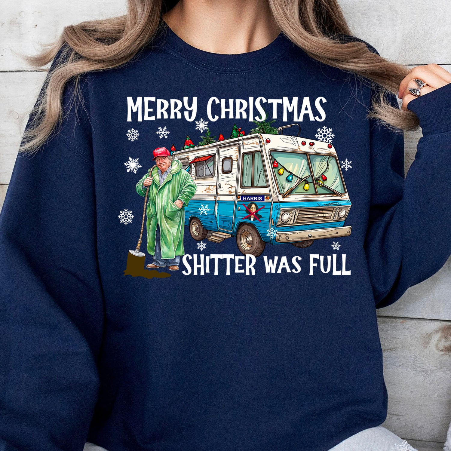 This festive t-shirt design features a playful illustration of Trump dressed in casual attire, sporting a long green coat and a red hat with his name on it. Next to him is a van adorned with Christmas decorations, adding to the holiday spirit. On the van's door, there’s an image of Kamala Harris with a bold red "X" over her, symbolizing a ban. Above the van, the phrase "Merry Christmas" is displayed in black text, while below it, the humorous phrase "Shitter Was Full" is printed, also in black. Snowflakes fall around Trump and the van, completing this lighthearted, Christmas-themed design.
