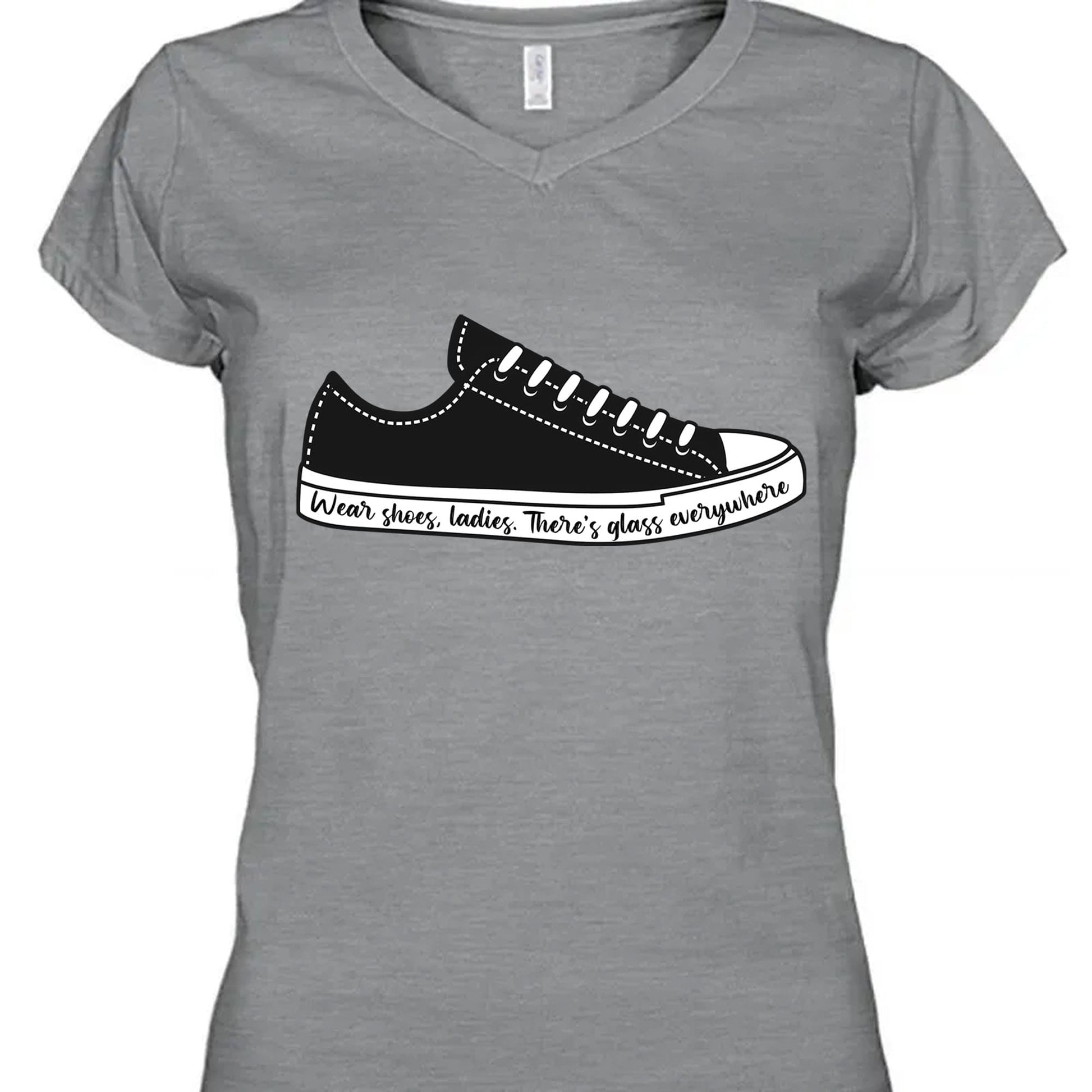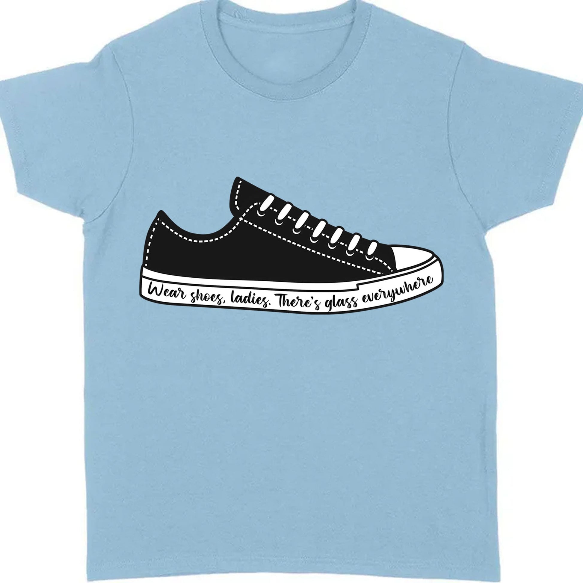 This t-shirt design features a stylish illustration of a sneaker with a powerful message. On the sneaker, the text "Wear shoes, ladies. There's glass everywhere" is elegantly written in a flowing script font. The design symbolizes breaking barriers and overcoming challenges, with the phrase hinting at the concept of "breaking the glass ceiling." The sneaker adds a casual, modern touch, making the shirt both fashionable and meaningful. It’s perfect for those who embrace empowerment and strength with a subtle yet impactful statement. The design uses black and white colors, highlighting support for Kamala Harris in a unique way.
