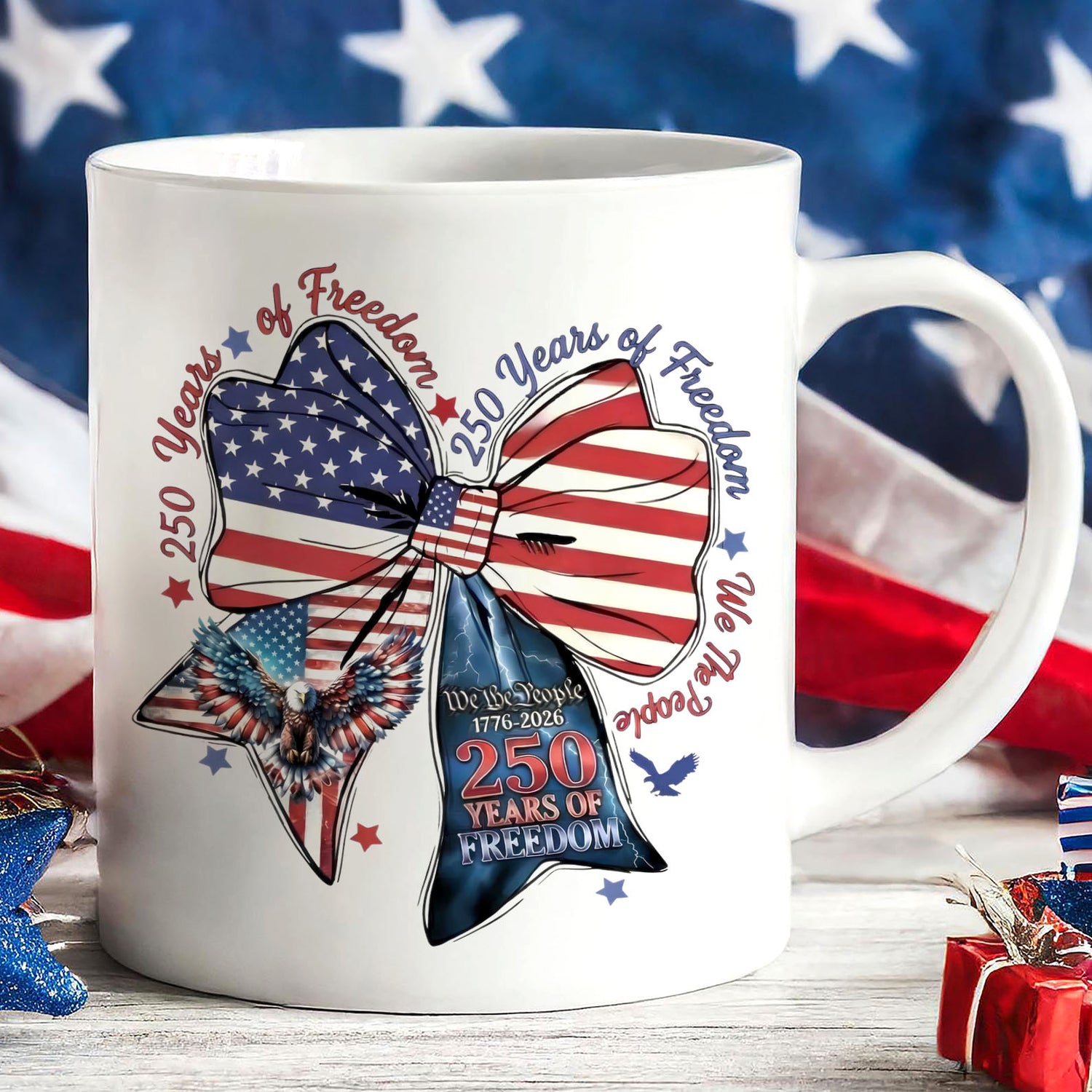 250 Years of Freedom Coquette Bow Mug | Patriotic We The People 1776–2026 White Mug Accent Mug 684221