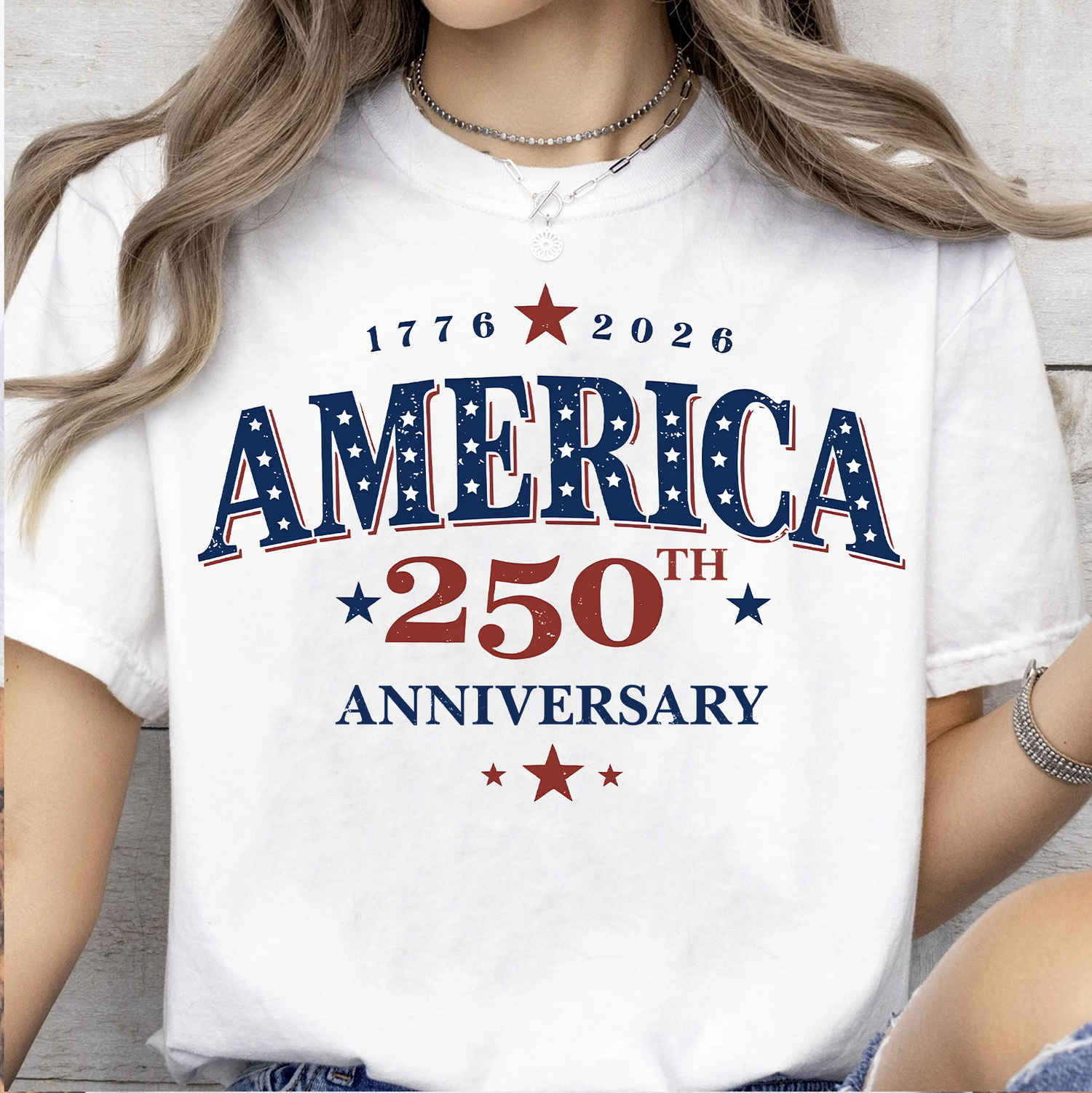 Get ready to celebrate a monumental milestone in American history with this classic, vintage-inspired shirt, designed specifically for the nation's upcoming 250th anniversary. The bold, patriotic front graphic proudly features the word "AMERICA" styled in a distressed blue font adorned with white stars, perfectly capturing a timeless Americana aesthetic. Framed by the historic dates "1776" and "2026," the design prominently highlights the semiquincentennial with striking red and blue typography, accented by classic five-pointed stars. Available in a variety of comfortable, easy-to-style colors like light grey, white, and sand, this versatile apparel piece is the ultimate way to show off your national pride during Fourth of July festivities, parades, and everyday historical celebrations.