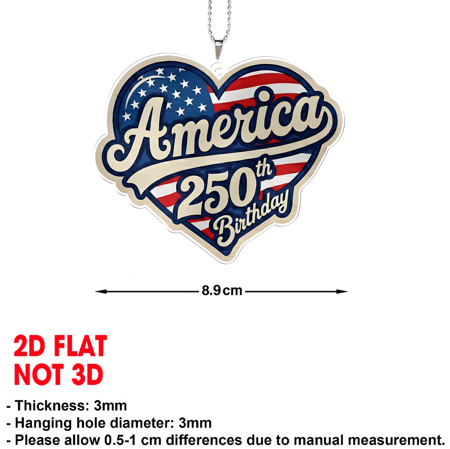 Show your American pride on every drive with this charming heart shaped car ornament, created specifically for 250th anniversary festivities of the United States. Suspended beautifully from your rearview mirror, the eye-catching design features a vintage-inspired American flag motif complete with classic stars and stripes, prominently displaying "America 250th Birthday" in elegant, retro typography. It is a lovely, everyday reminder of your patriotic spirit and a perfect commemorative keepsake to brighten up your daily commute.