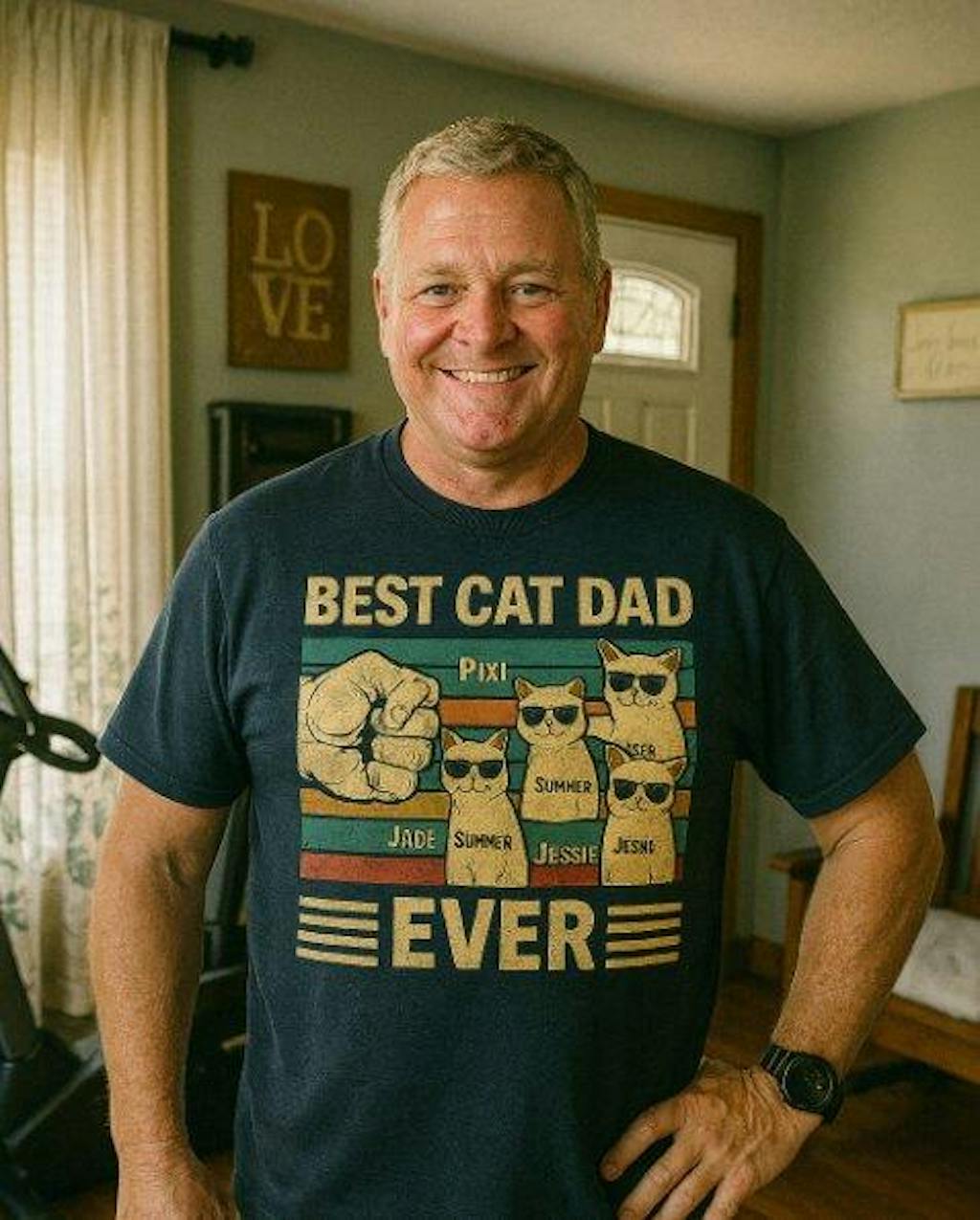 Thank you so much for taking the time to leave us a review. We're thrilled to hear that your husband loved his personalized cat dad shirt from your girls. We take pride in the quality of our products and we're so glad to hear that it held up well after washing. Thank you for choosing us for your Father's Day gift. We appreciate your support! :)