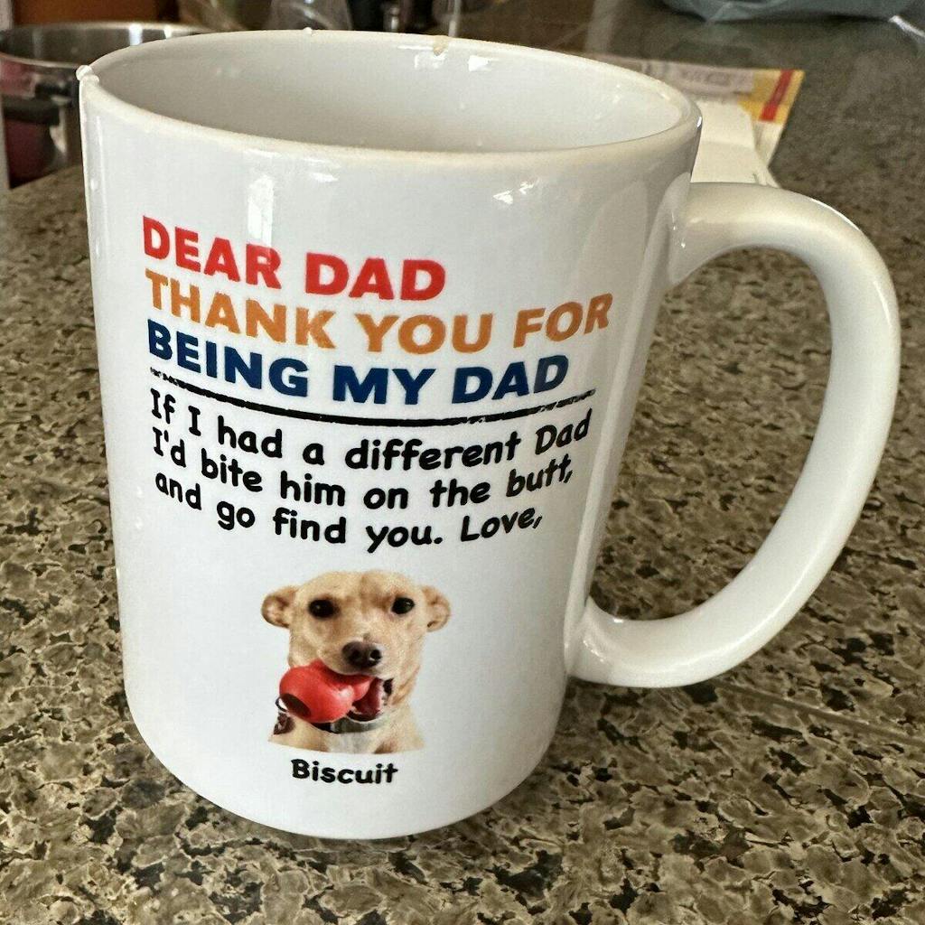 The personalized "Dad" mug is a gift for my grandson from his new puppy! I know he's going to love it! It's exactly what I was hoping for! More than met my expectations! I needed a little help figuring out how to complete the personalization and upload the picture. Thuy answered all my questions and made the process easy! Thank you so much!