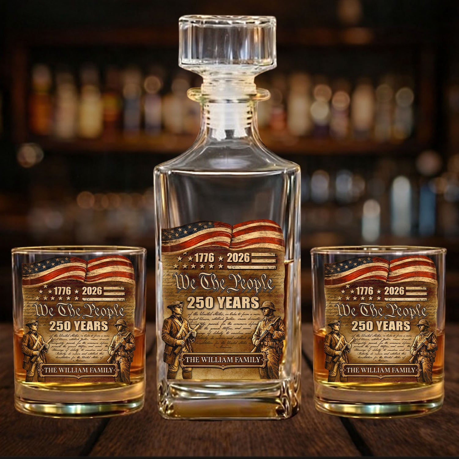 Custom Name 250 Years We The People 1776-2026 Whiskey Decanter Set, Patriotic Whiskey Bottle Whiskey Glass