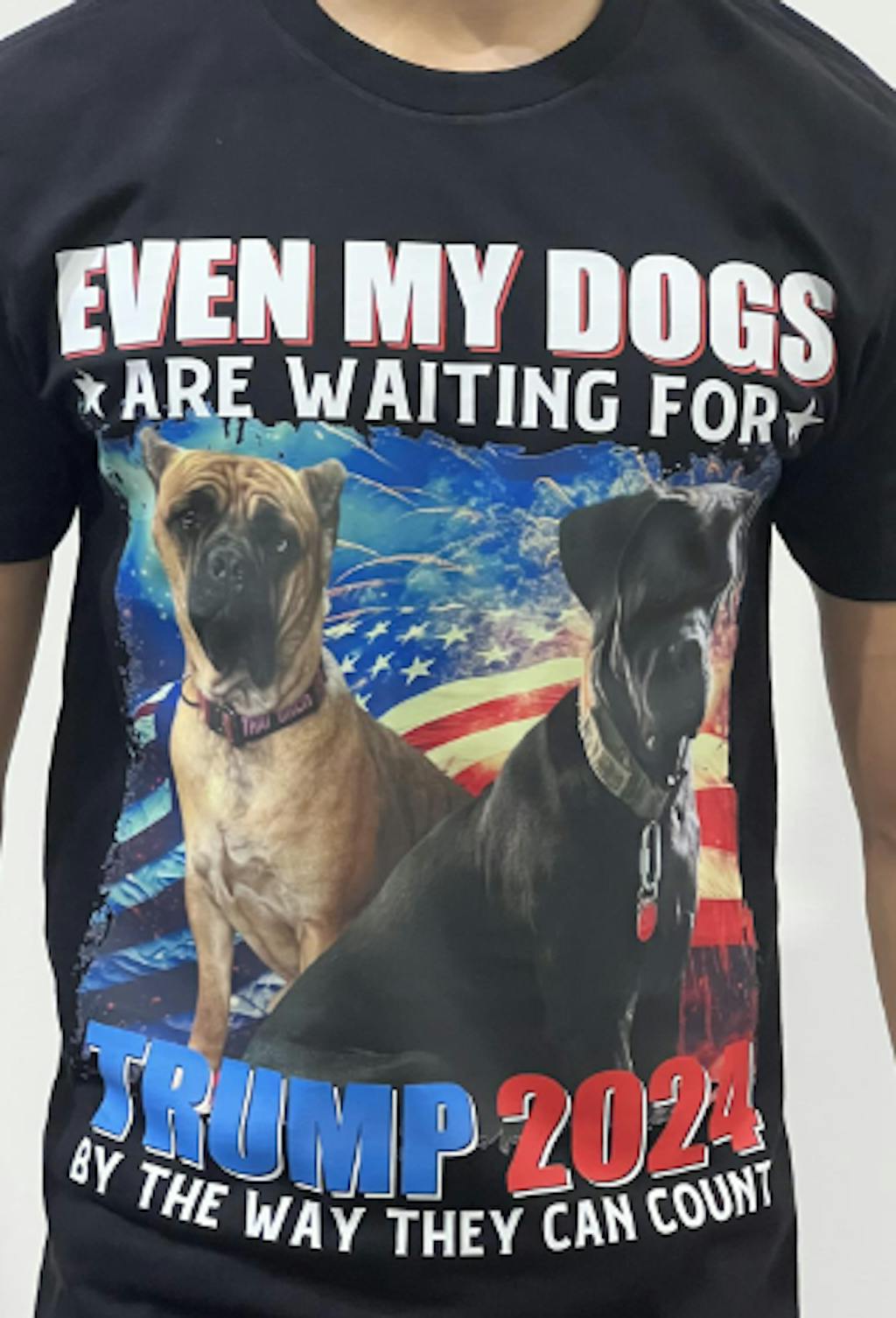 Show your support for Trump 2024 with this unique and personalized shirt! Featuring a custom photo of your beloved dogs, this shirt is perfect for any proud pet owner and Trump supporter.