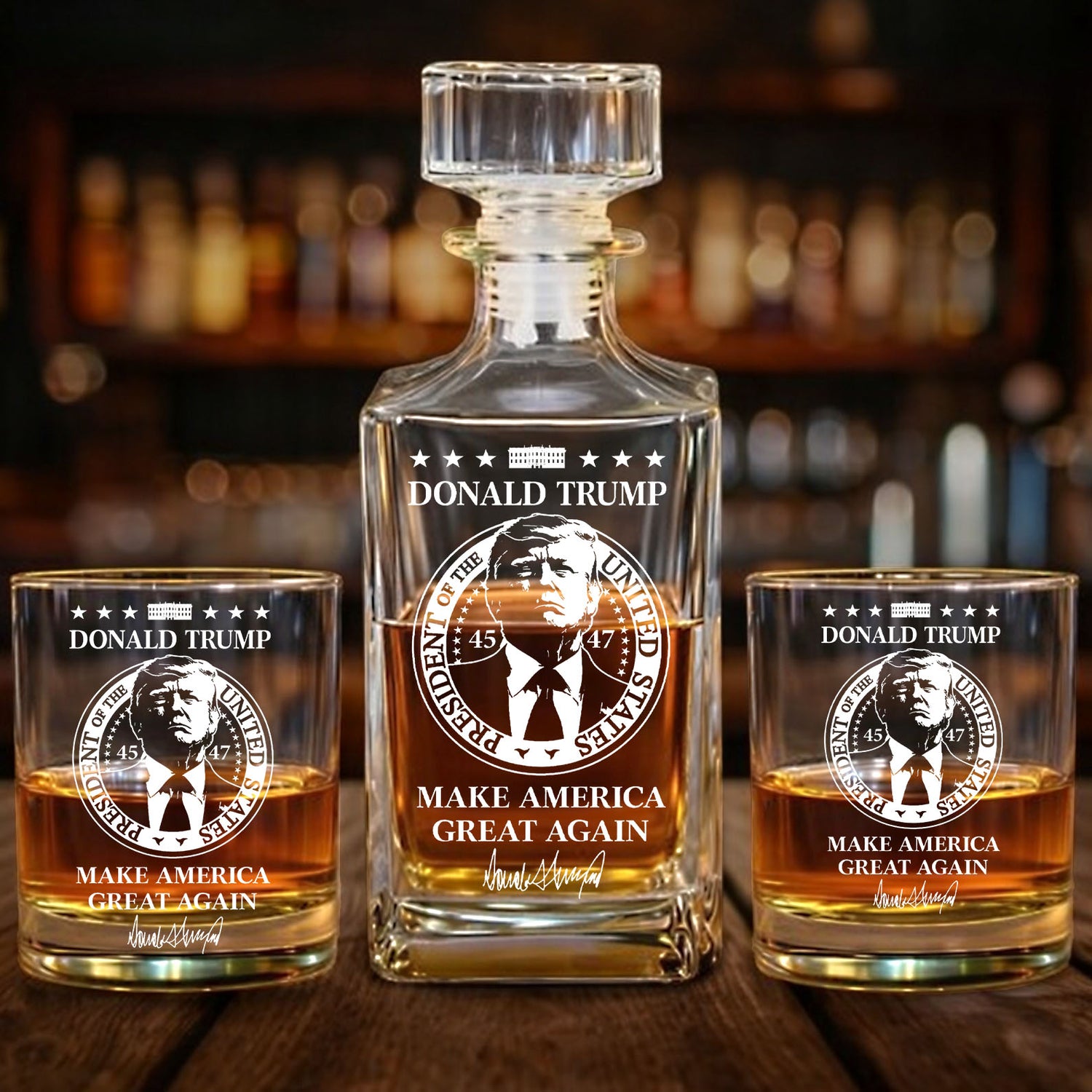 Donald Trump Whiskey Bottle, Trump 45 47 Whiskey Decanter Set, MAGA Wine Glass for Whiskey Lovers