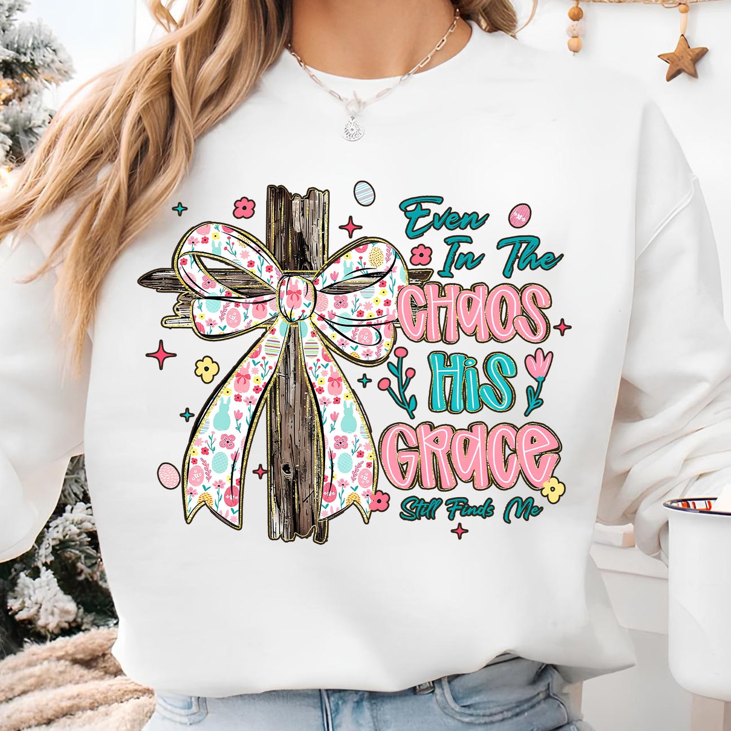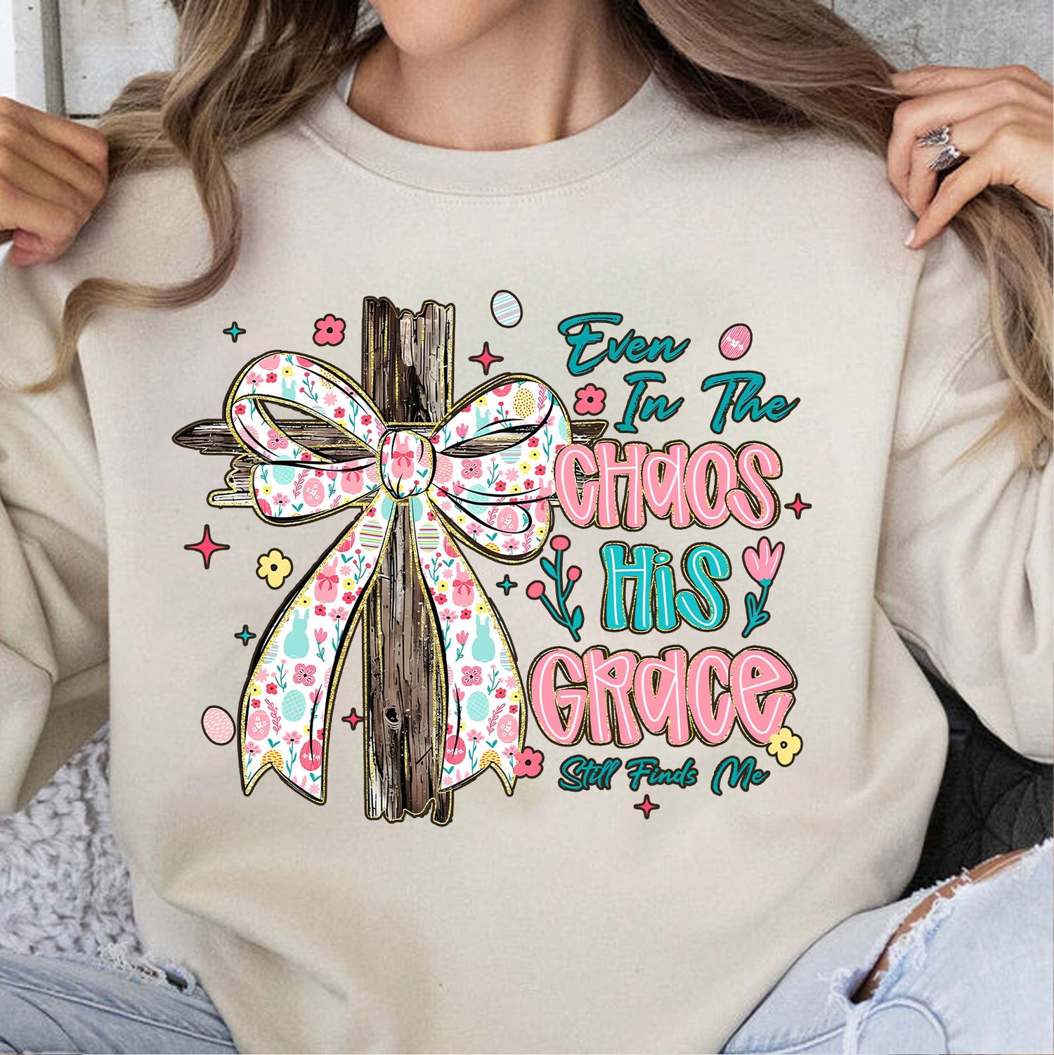 Even In The Chaos His Grace Still Finds Me Easter Bright Shirt | Christian Floral Bow Cross Faith Tee 684463