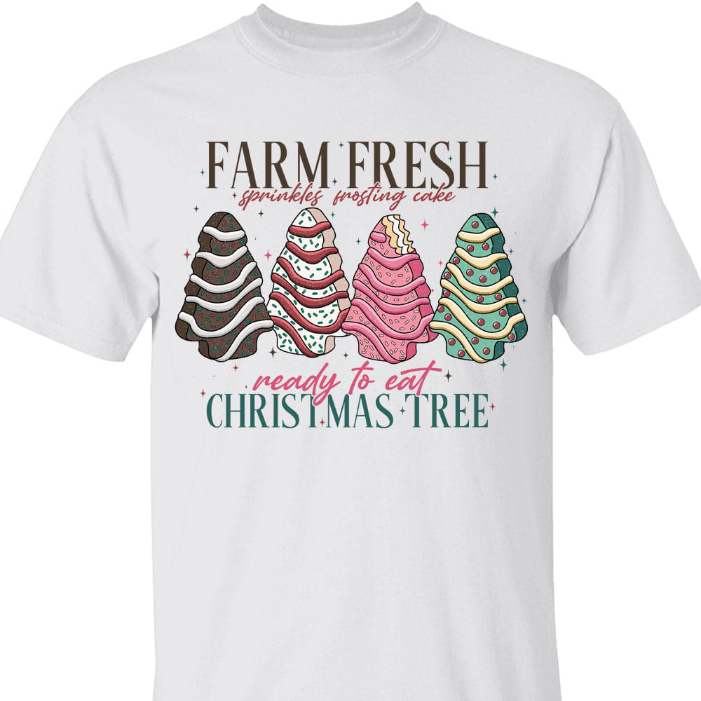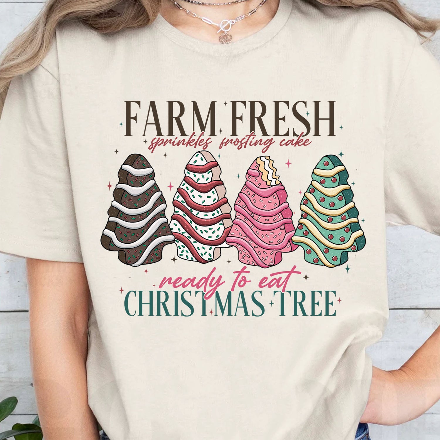 This sweatshirt design features the text "FARM FRESH" in large brown letters at the top, with smaller cursive words "sprinkles frosting cake" written in pink below it. Below the text, there are four illustrated Christmas tree-shaped cakes decorated with colorful sprinkles, frosting, and candy ornaments in festive colors like green, red, pink, and white. At the bottom of the design, the phrase "ready to eat CHRISTMAS TREE" is displayed, with "ready to eat" in pink script and "CHRISTMAS TREE" in green, adding a whimsical holiday vibe to the sweatshirt.