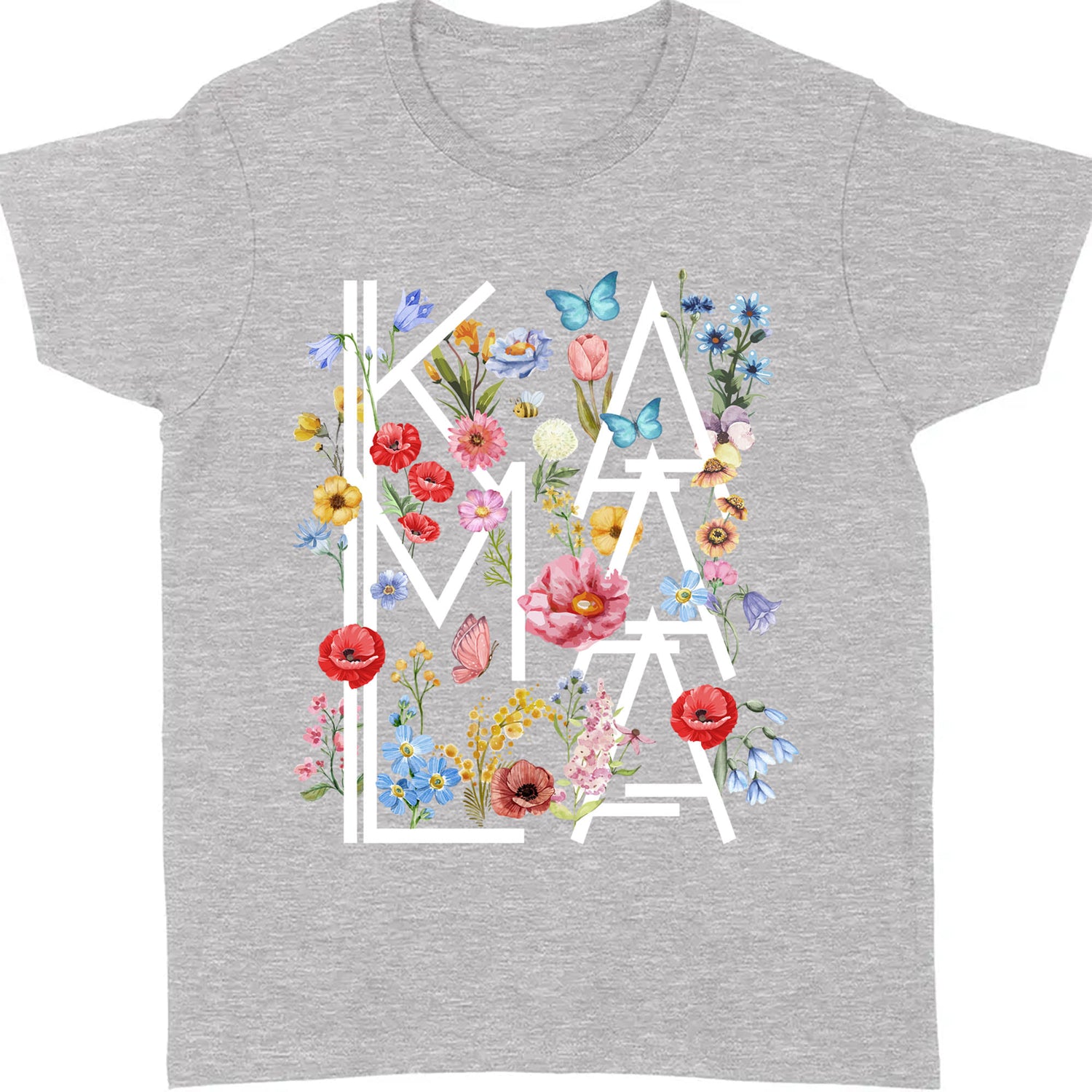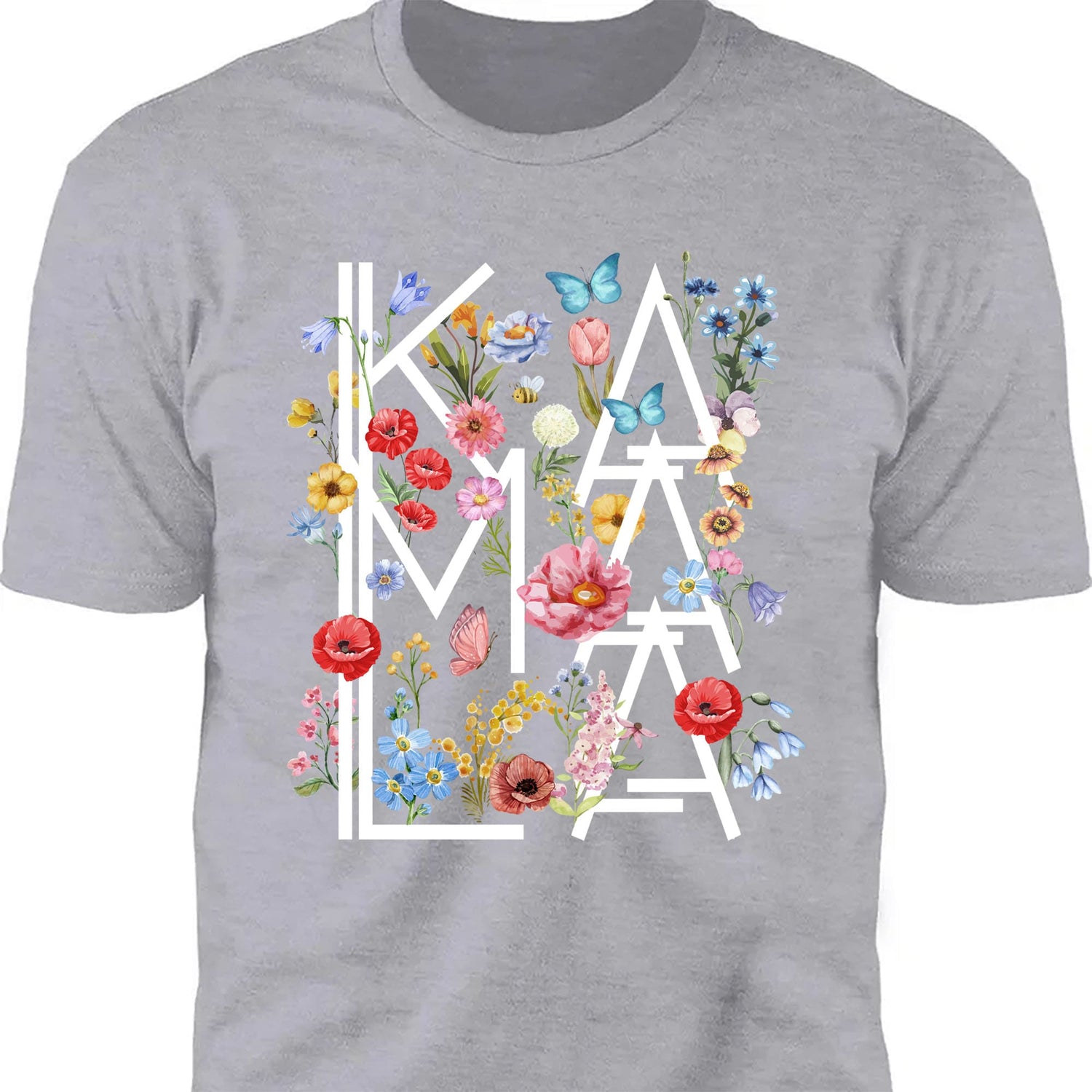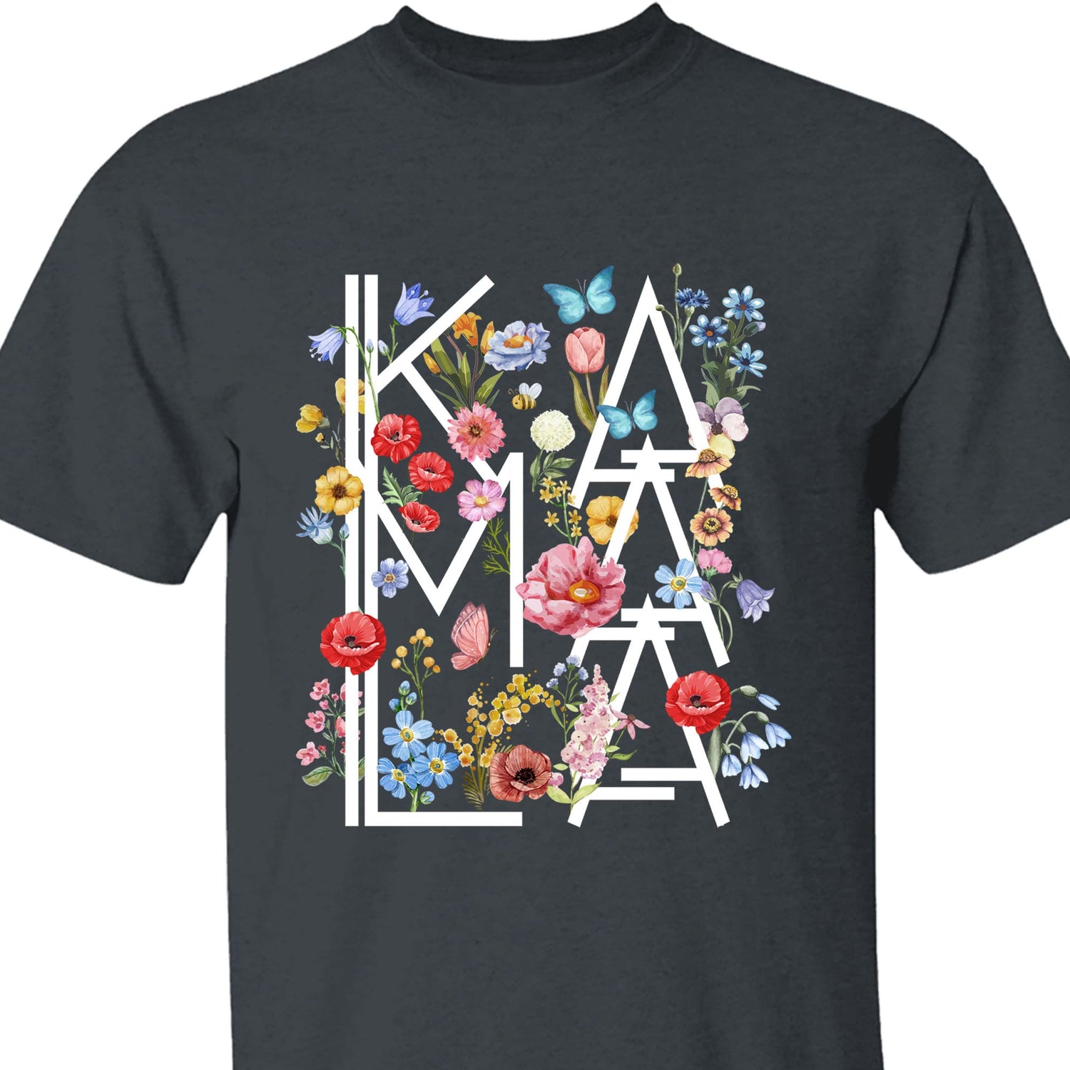 This stylish black t-shirt features the name "Kamala" in a bold, vertical block font. Each letter is intertwined with a variety of colorful, vibrant flowers and delicate butterflies, creating a beautiful floral display. The flowers range from vivid red poppies to soft pastel blooms, alongside butterflies in shades of blue, bringing a fresh and natural feel to the design. The combination of the strong, minimalist typography and the lively floral pattern strikes a balance between boldness and elegance, making this shirt a unique tribute to Kamala Harris.