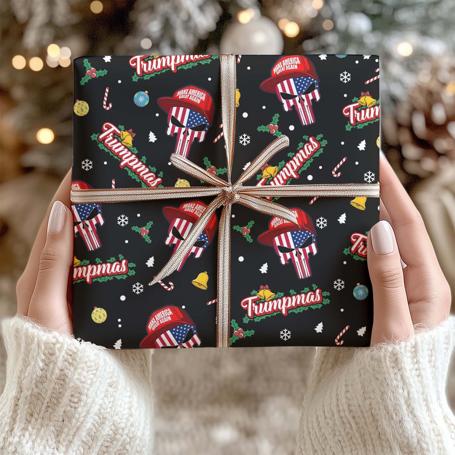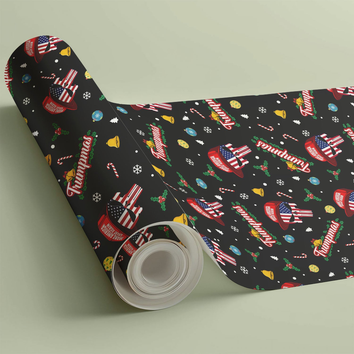 Unwrap the holiday spirit with our Funny Trump Santa Skull Wrapping Paper! Featuring a playful design of a skeleton wearing a vibrant red MAGA hat, this unique wrapping paper is adorned with the cheeky pattern "Trumpmas." Perfect for adding a touch of humor to your Christmas gifts, it’s ideal for fans of political satire and festive fun. Make your presents stand out this holiday season with this one-of-a-kind wrapping paper that’s sure to spark laughter and conversation. Get ready to celebrate with style and a twist of irony!
