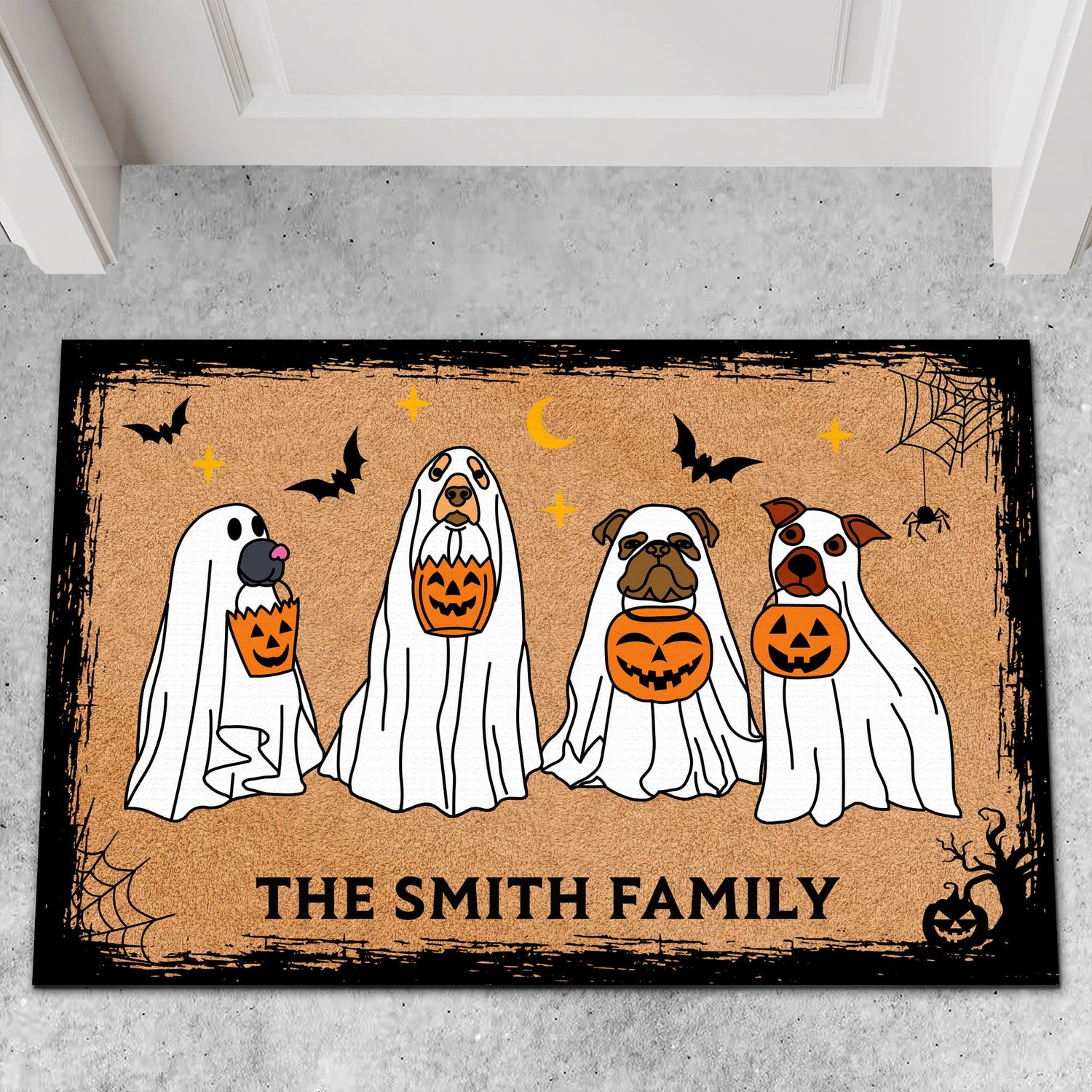 Welcome visitors with a touch of whimsical Halloween spirit with this charming doormat design. The mat features four adorable dogs, each dressed in a playful ghost costume. The costumes are simple yet endearing, with each dog appearing as if they’ve draped themselves in a white sheet, with eye cutouts that allow their eager eyes to peek through. Each dog holds a pumpkin-shaped bag in their mouth, suggesting they’re ready for a night of trick-or-treating. The scene is set under a twilight sky where silhouettes of bats flit overhead, adding to the festive Halloween atmosphere.