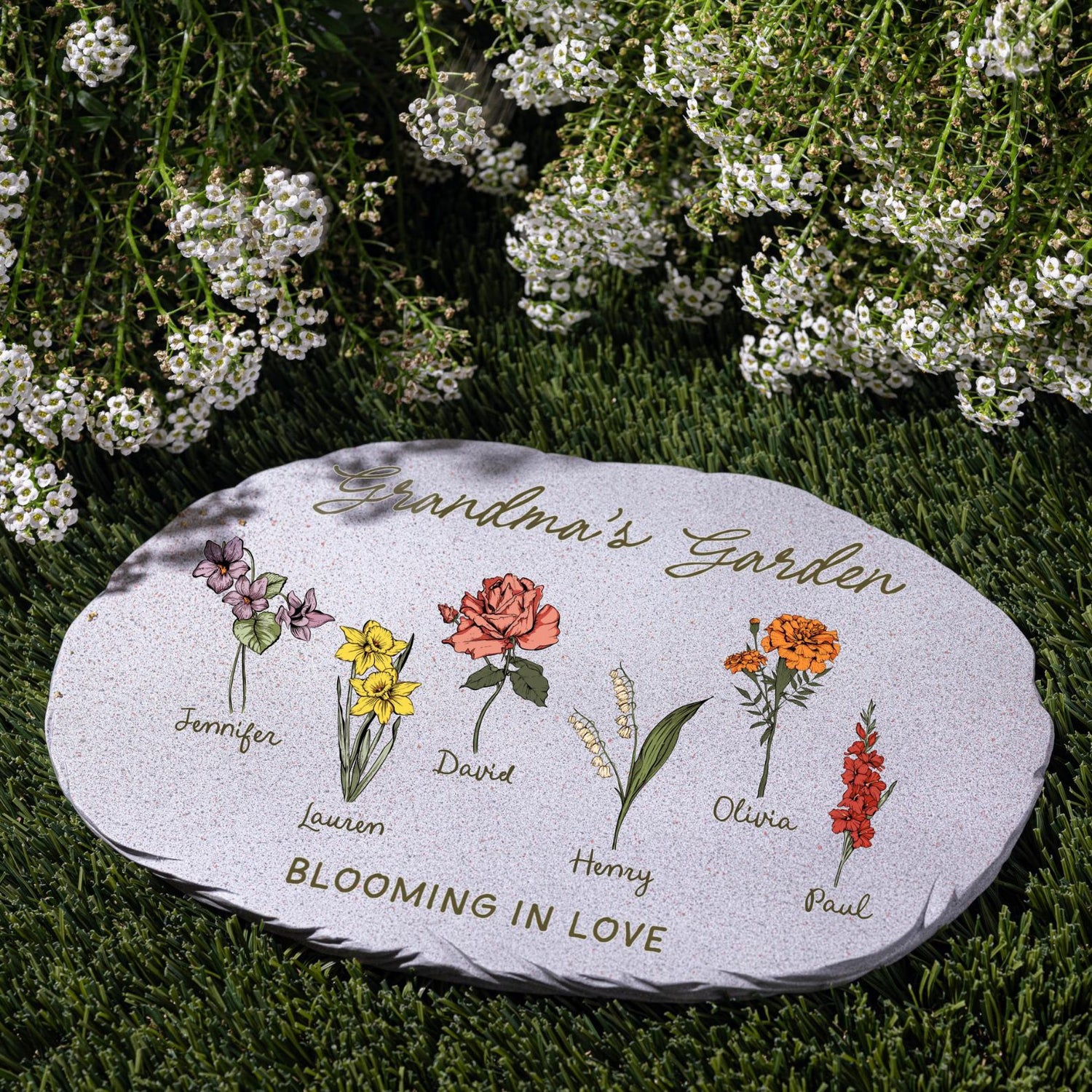 Celebrate the love that grows through generations with this Personalized Grandma Garden Stone, a meaningful keepsake designed to brighten any outdoor space. Featuring beautifully illustrated custom birth flowers paired with names, this unique garden stone transforms Grandma’s garden into a heartfelt tribute to her children and grandchildren. Crafted from durable, weather-resistant material, it’s perfect for outdoor display year-round while maintaining its vibrant design. Whether you’re searching for a thoughtful Mother’s Day gift, birthday surprise, or a sentimental family keepsake, this custom garden stone is a touching way to honor the special bond you share—because every family blooms with love.