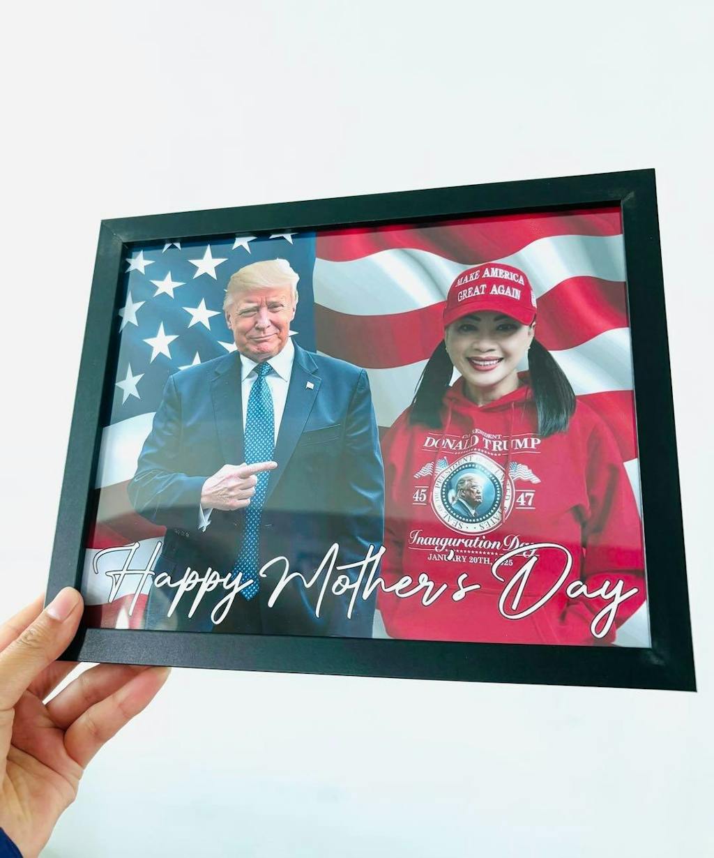 This custom picture frame features a high-quality print with former President Donald Trump, set against a patriotic American flag background. On the right side, a customizable photo of your choice is seamlessly integrated, making it a unique and personal gift. The custom text is elegantly displayed in a stylish, red cursive font, adding a warm and festive touch. The frame itself is sleek and modern, perfect for displaying on a shelf, desk, or wall to celebrate a special day with your family.