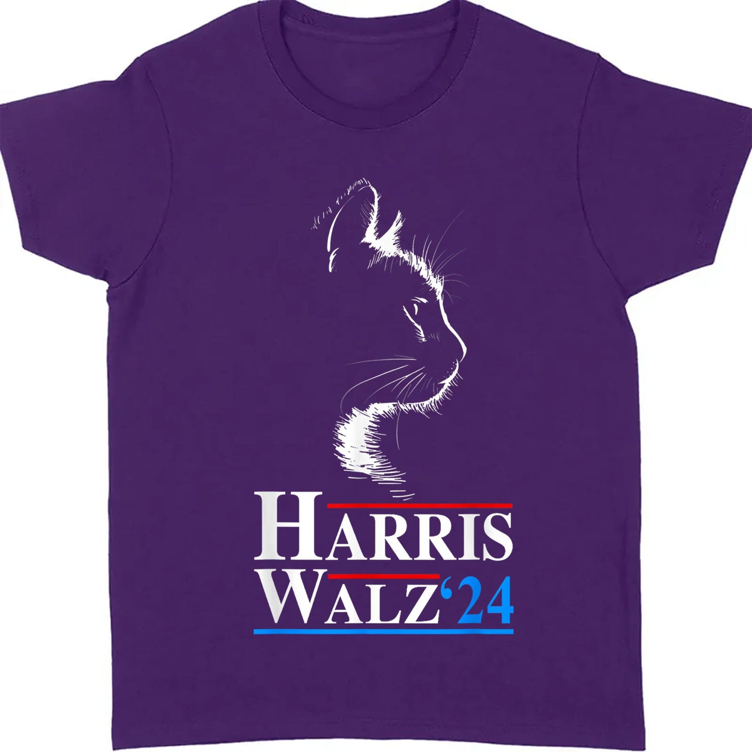 This t-shirt features a striking and elegant design of a cat's silhouette. The detailed, minimalist cat profile adds a touch of sophistication and intrigue. Below the cat image, the text "Harris Walz '24" is prominently displayed, with "Harris" and "Walz" separated by red and blue lines, emphasizing the political theme of the design. The '24 is highlighted in blue, giving a modern and patriotic feel to the shirt. This design is perfect for those who support the Harris-Walz campaign and appreciate subtle.