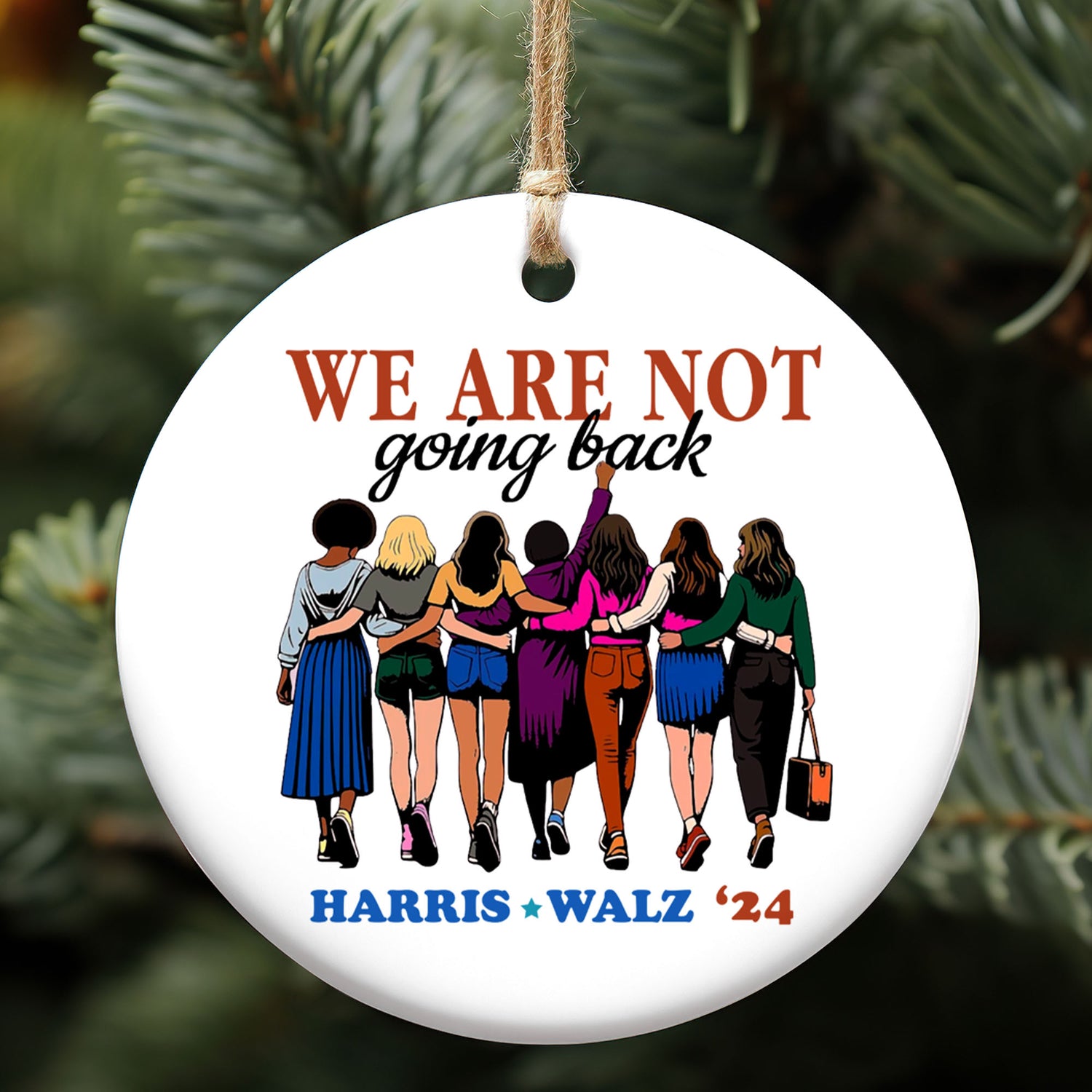 This ornament powerfully conveys a message of solidarity and forward progress. At the top, bold text reads "We Are Not Going Back," emphasizing a commitment to continue moving forward. Below the text is an illustration of diverse women standing arm-in-arm, facing forward, symbolizing unity and strength. At the bottom, "Harris * Walz '24" is displayed in blue with a star in the middle, supporting their 2024 campaign. This ornament is perfect for anyone who values progress and wants to show their support for change and equality.