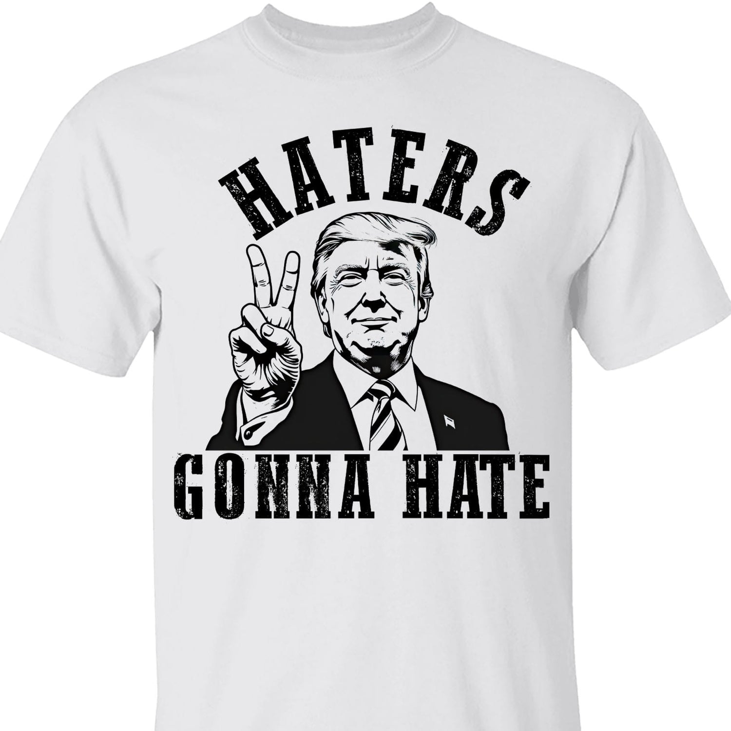 This shirt design features a bold black-and-white illustration of Donald Trump making a peace sign with his hand. Above him, the word "HATERS" is displayed in a large, serif font with a distressed, grunge style, giving it a rough, vintage look. Below the illustration, the phrase "gonna hate" is printed in the same font and style, completing the phrase in a bold and edgy way. The minimalist black-only color scheme makes the design striking and visually impactful, delivering a strong statement with a simple yet powerful aesthetic.