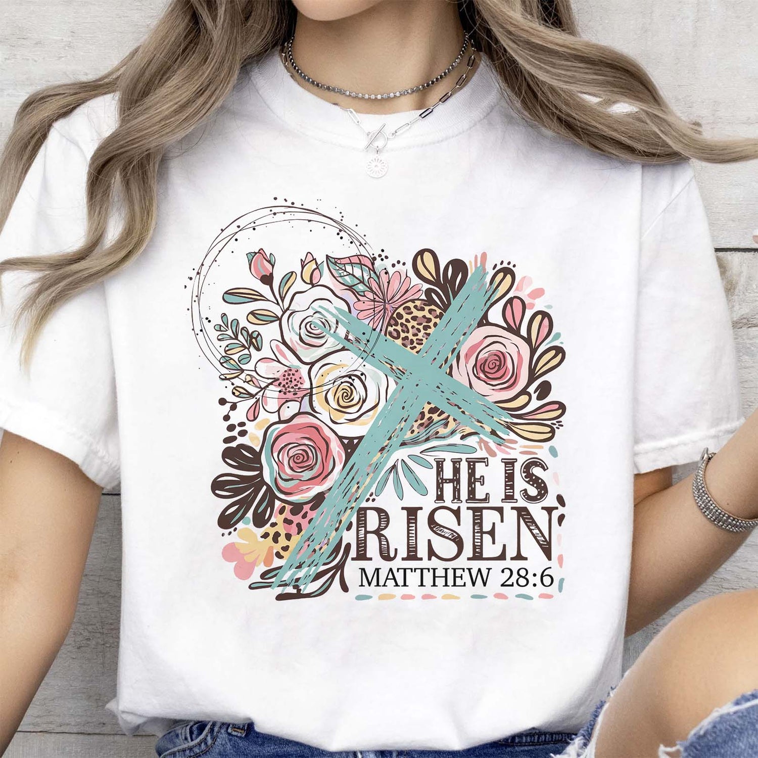He Is Risen Matthew 28:6 Christian Easter Shirt | Floral Cross Faith T-Shirt 684406
