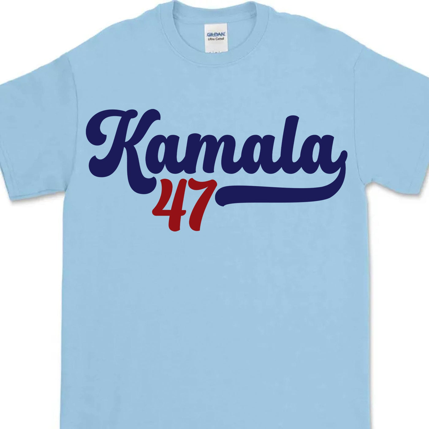 This t-shirt features a simple yet bold design with political significance. "Kamala" is written in large, navy blue letters with a retro-inspired curvy script style. The number "47" appears below in a contrasting red color. A navy blue underline extends from the end of "Kamala," giving the design a dynamic, forward-moving feel. The "47" likely refers to the potential 47th president of the United States, suggesting this is a campaign or support shirt for Kamala Harris in a future presidential run.