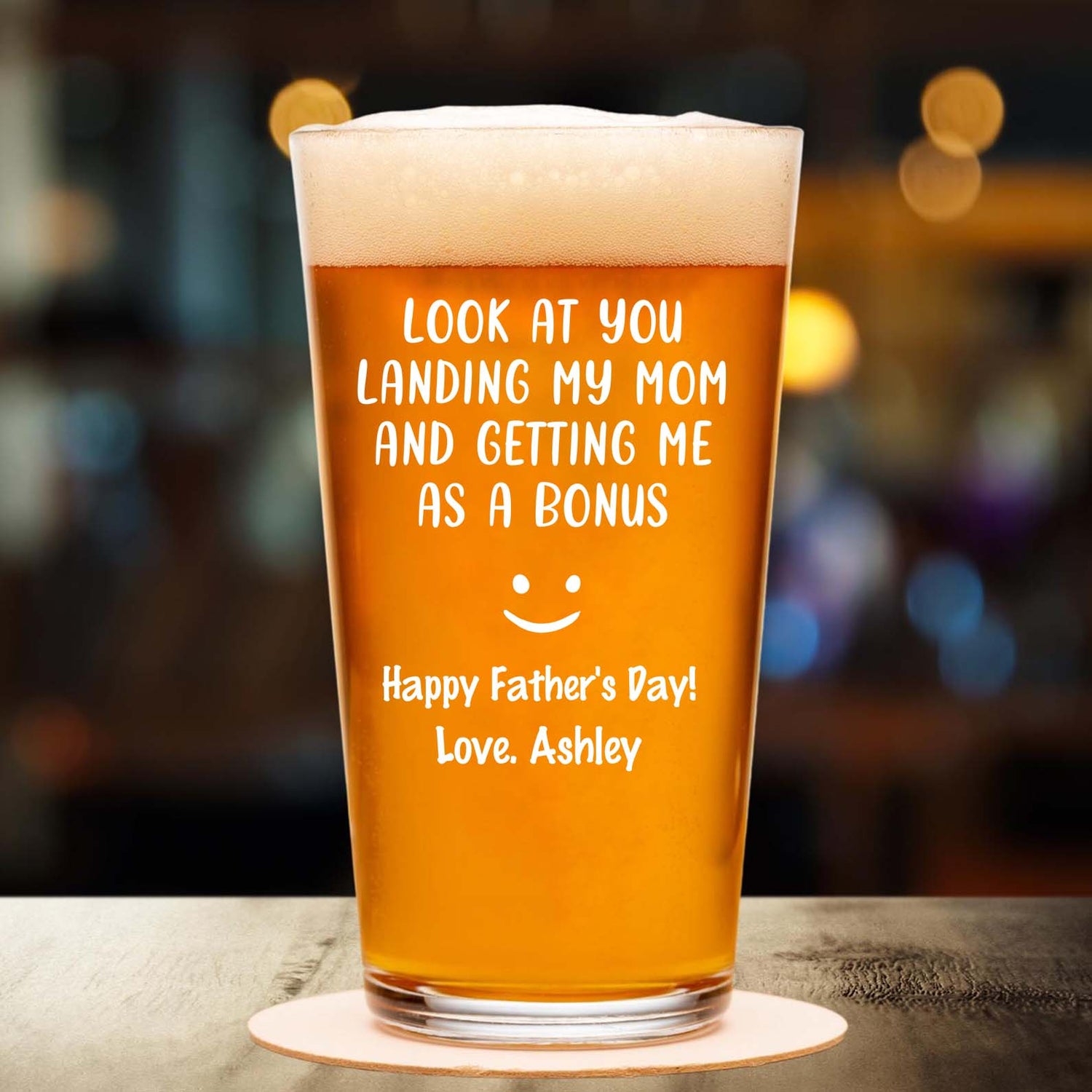Personalized funny whiskey or beer glass for stepdad – a perfect Father’s Day gift for your bonus dad with a playful twist.Featuring the hilarious message “Look At You Landing My Mom And Getting Me As A Bonus,” this custom glass adds humor and heart to every sip. Whether he prefers a cold beer or a smooth whiskey, this unique gift will make your stepdad, bonus dad, or best stepfather smile with pride.