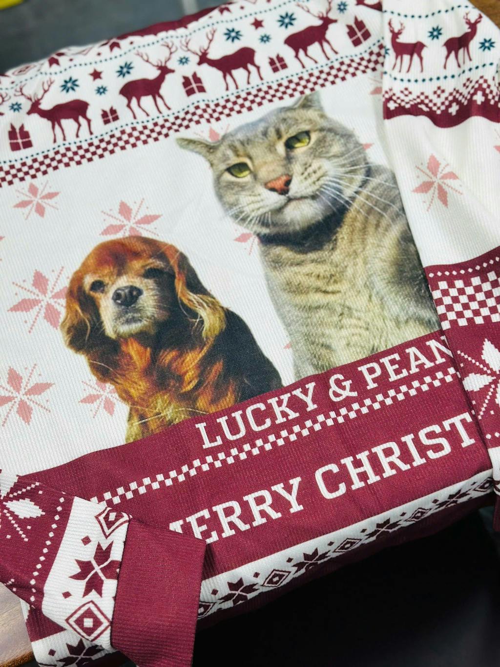 I ordered this custom Christmas sweater for my daughter, and it was one of the most meaningful gifts I've ever given. The print of our pets, Lucky and Peanut, came out beautifully, and the festive design added such a warm touch. What impressed me most was the affordability — it was cheaper than other custom options I looked at, but the quality was still fantastic. My daughter absolutely loved it, and it made our holiday even more special. Highly recommend for anyone wanting a personalized gift