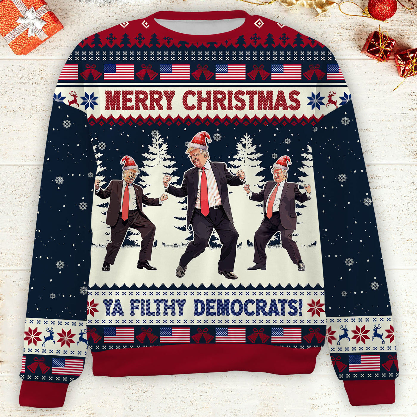 Merry Christmas Ya Filthy Democrats, Funny Trump Dancing Ugly Sweater, Trump 2024 Christmas All-Over-Printed Sweatshirt.