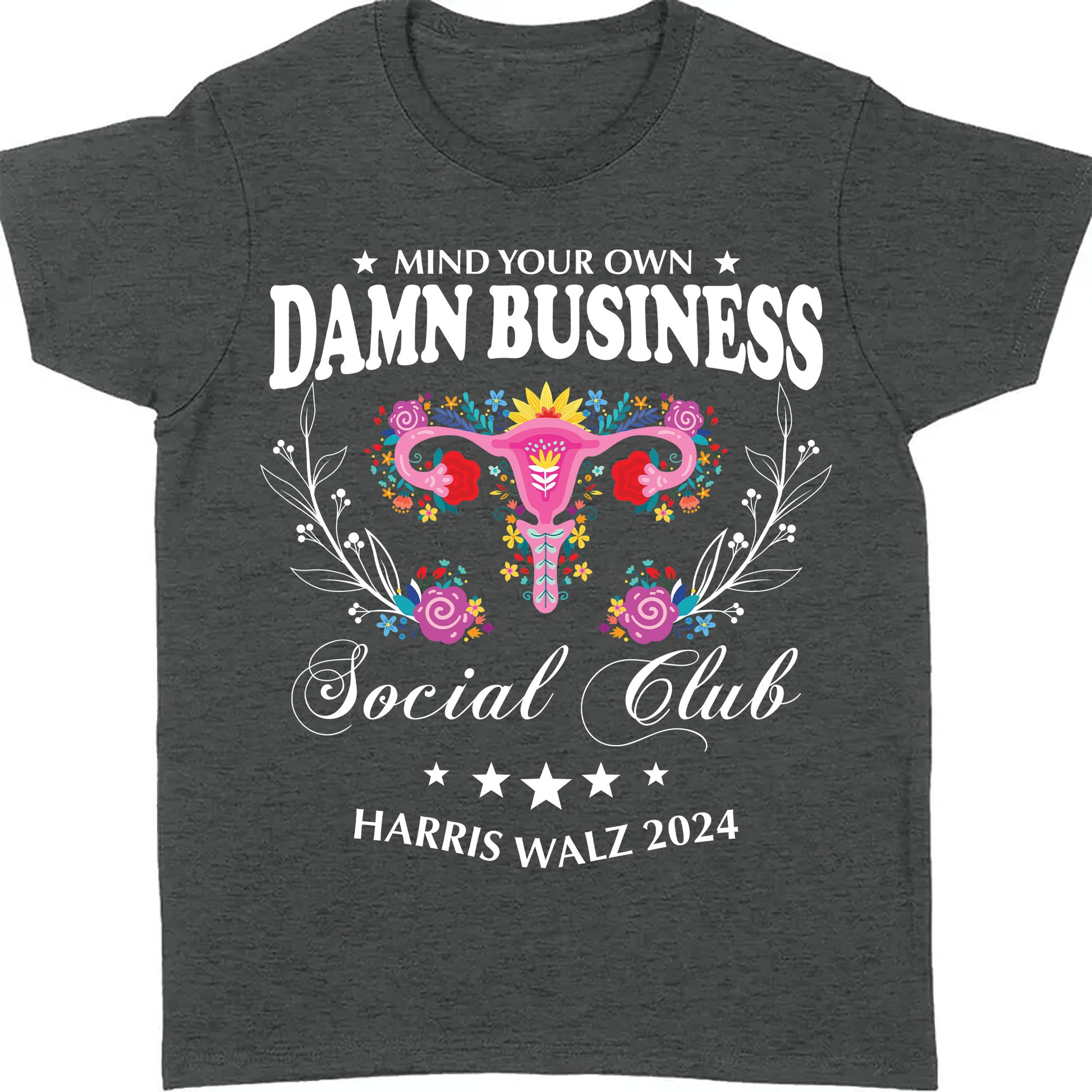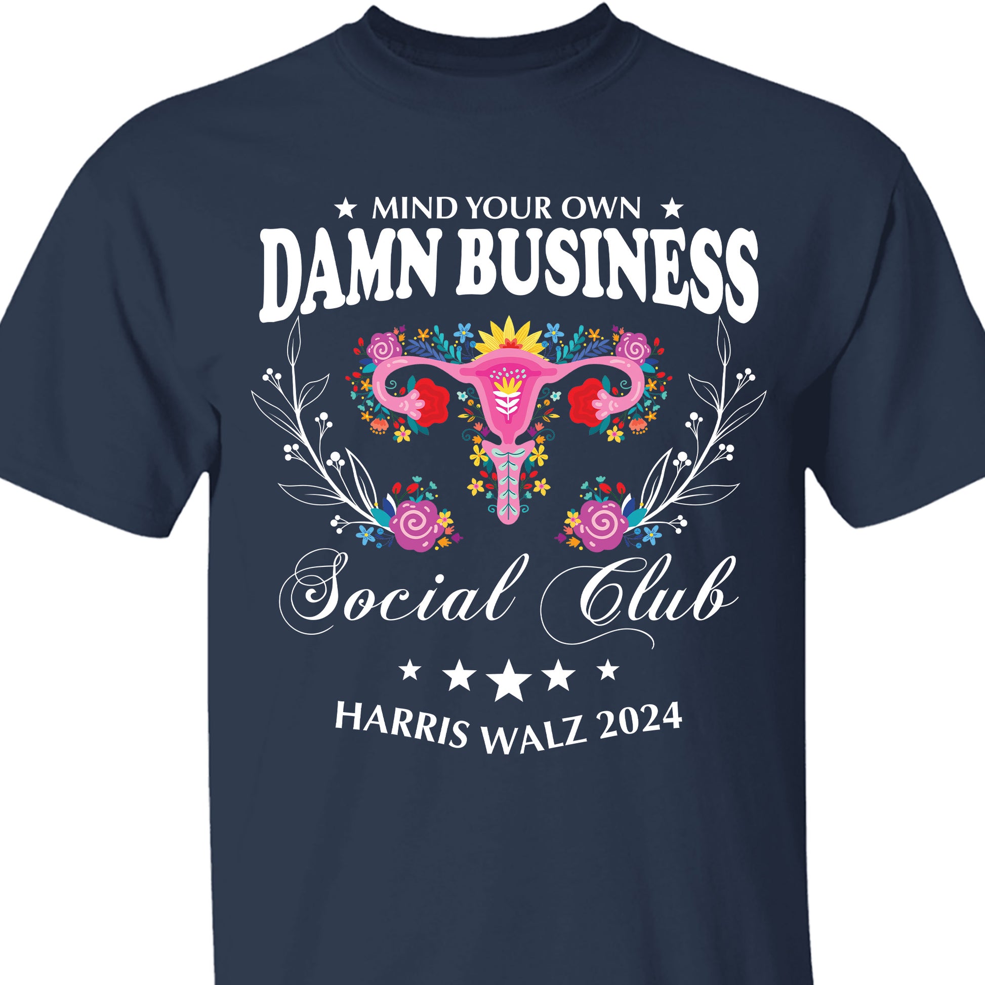 This t-shirt design features bold, impactful text at the top that reads "MIND YOUR OWN DAMN BUSINESS," surrounded by stars. Below the text is a colorful, floral uterus illustration, decorated with bright flowers and intricate details, adding a vibrant and symbolic touch to the design. Beneath the uterus image is the phrase "Social Club," written in an elegant, cursive font, giving the design a stylish, empowering vibe. At the bottom, the shirt reads "HARRIS WALZ 2024," with stars on either side, indicating support for the Harris-Walz political campaign. The overall design combines boldness and artistry to convey a strong, feminist message.