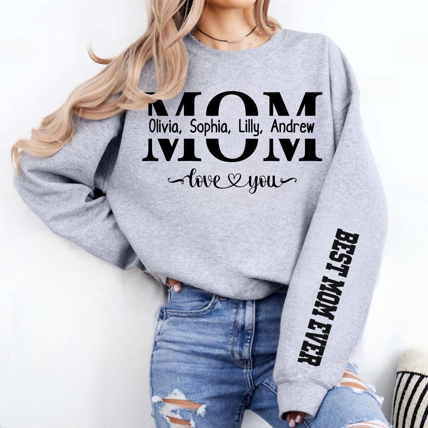 Celebrate the amazing mom in your life with this customizable "Best Mom Ever" sweatshirt—a perfect gift to show your love and appreciation! Featuring a bold "MOM" design with her children's names and a sweet "love you" message, this cozy sweatshirt is both stylish and meaningful. Simply provide the names you'd like displayed, and we'll create a one-of-a-kind sweatshirt that Mom will treasure forever. Give Mom a warm hug every day with this personalized sweatshirt—a stylish and sentimental gift she'll love!