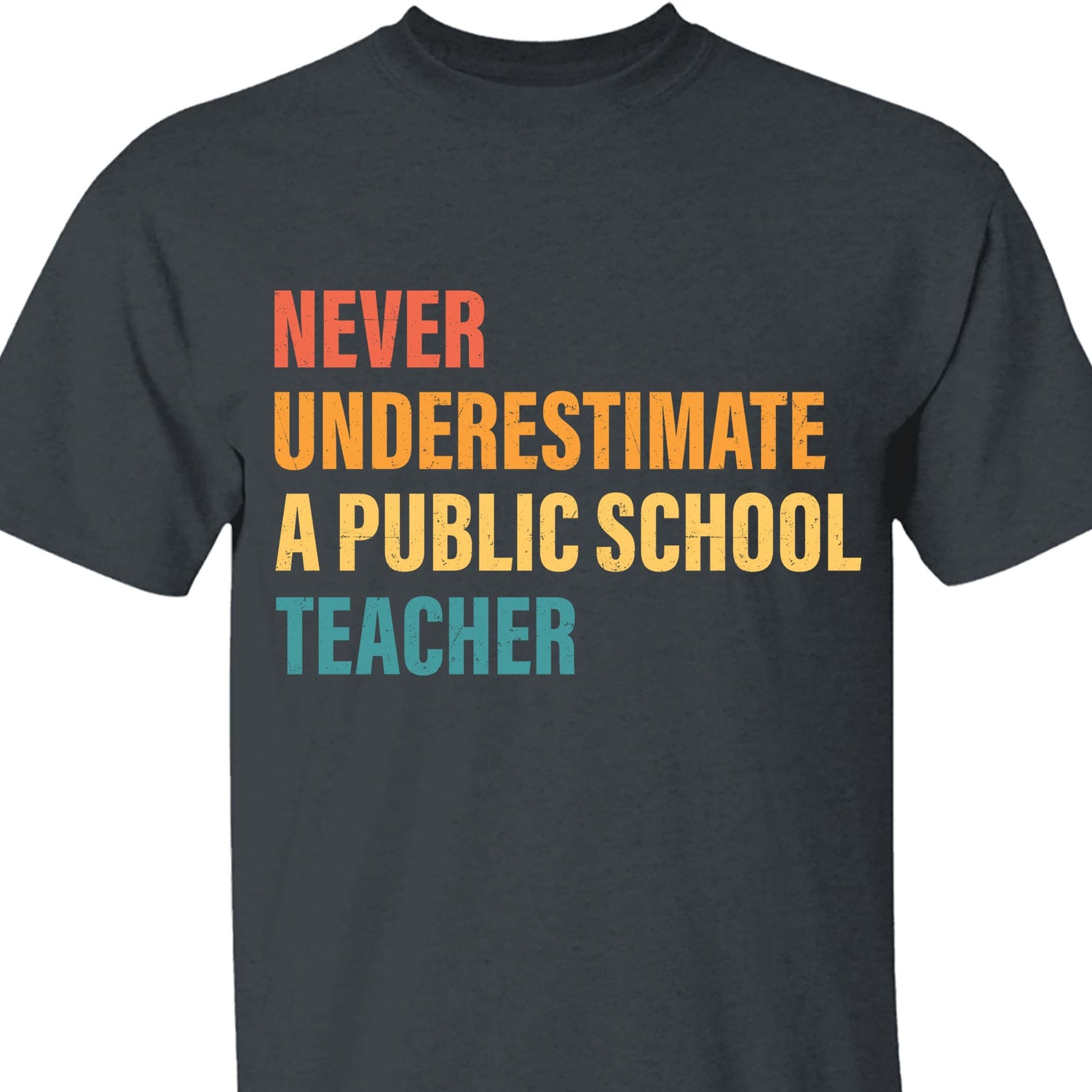 This t-shirt features the impactful phrase "Never underestimate a public school teacher," presented in a bold, grunge-style font. Each line of the design is color-coded to add vibrancy and emphasize the strength of the message. The words are aligned to the left and placed on separate lines for clarity, creating a clean yet dynamic design. The grunge style gives the text a bold and weathered look, adding character and reinforcing the resilience and strength of public school teachers. This shirt is a powerful statement of respect and admiration for educators, celebrating their often underestimated role in shaping the future.