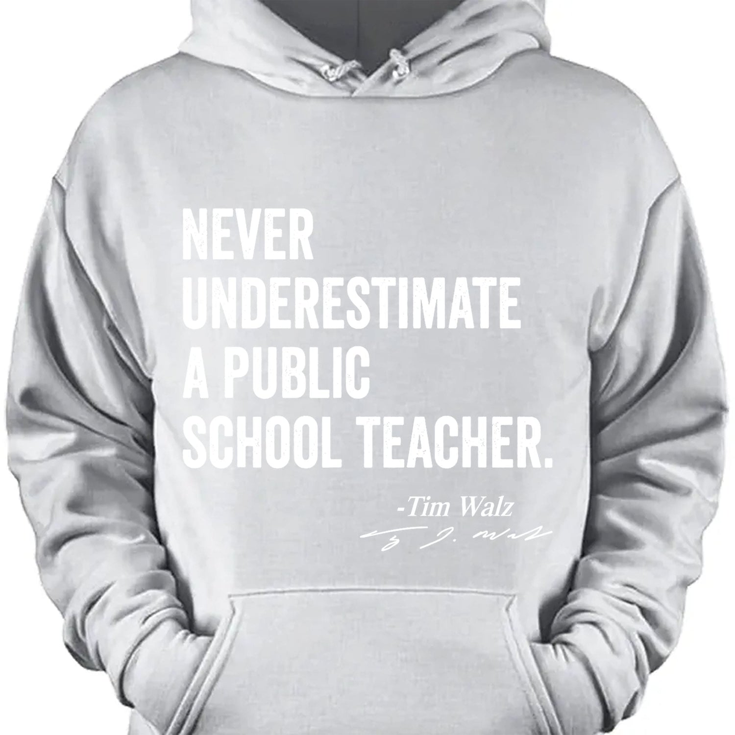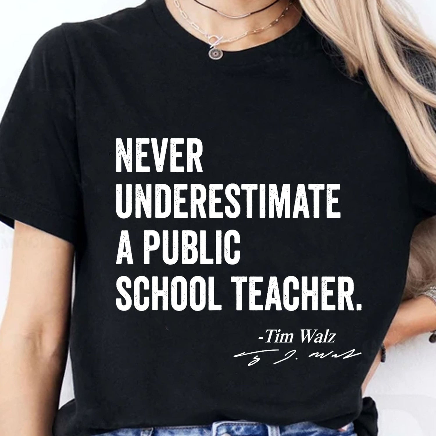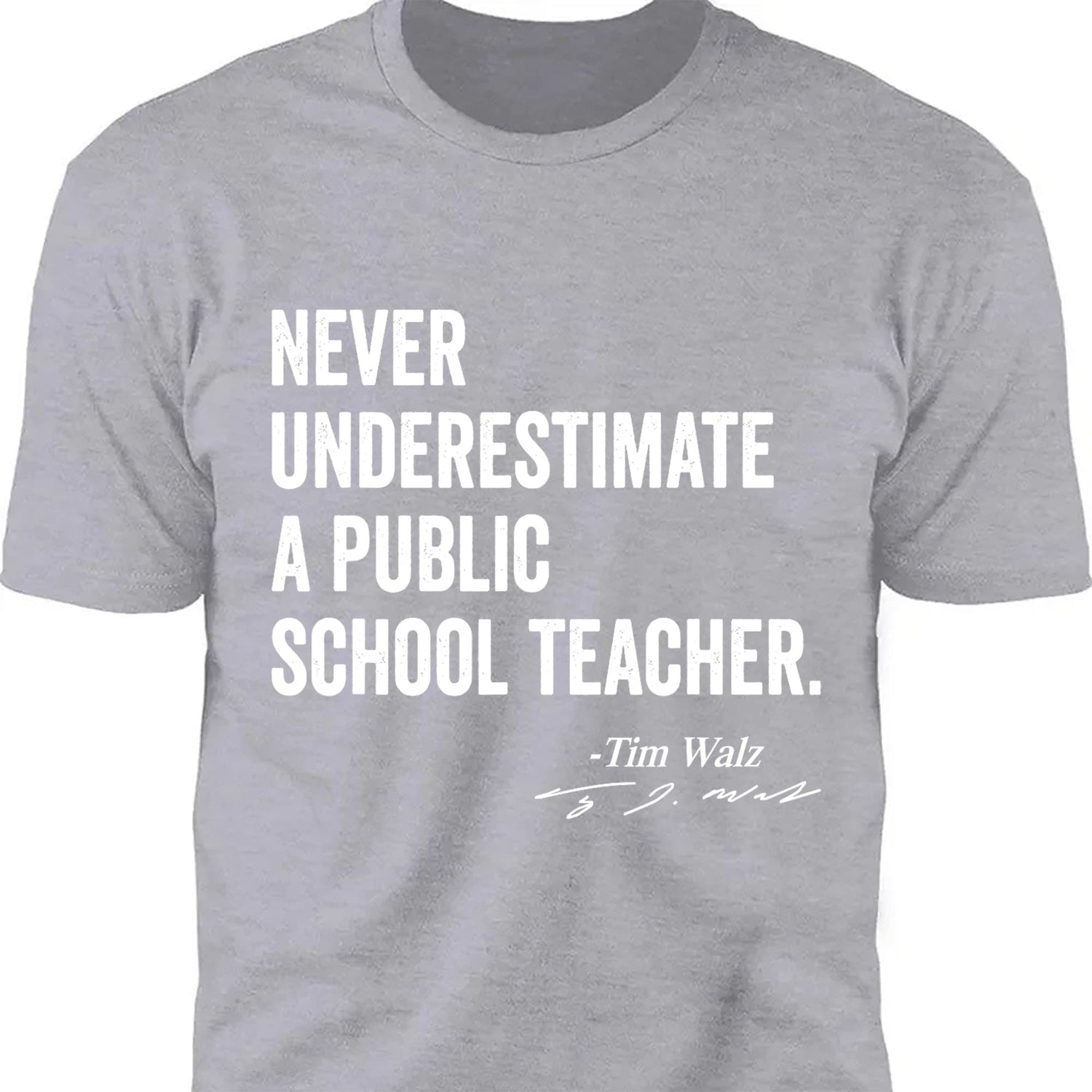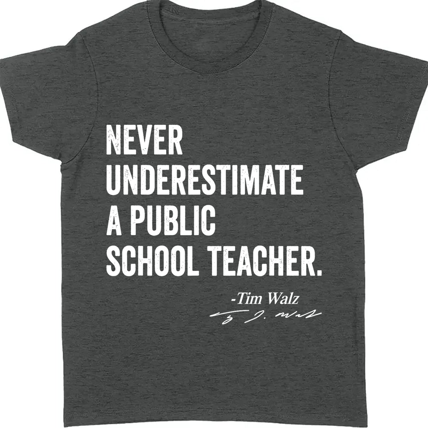This t-shirt design features a bold, left-aligned stack of four phrases: "never," "underestimate," "a public," and "school teacher," creating a powerful and impactful message. Below this, aligned to the right, is the text "Tim Walz," followed by his signature underneath, giving a personal touch and highlighting his support for public education. This design blends a strong statement with a simple, professional aesthetic.