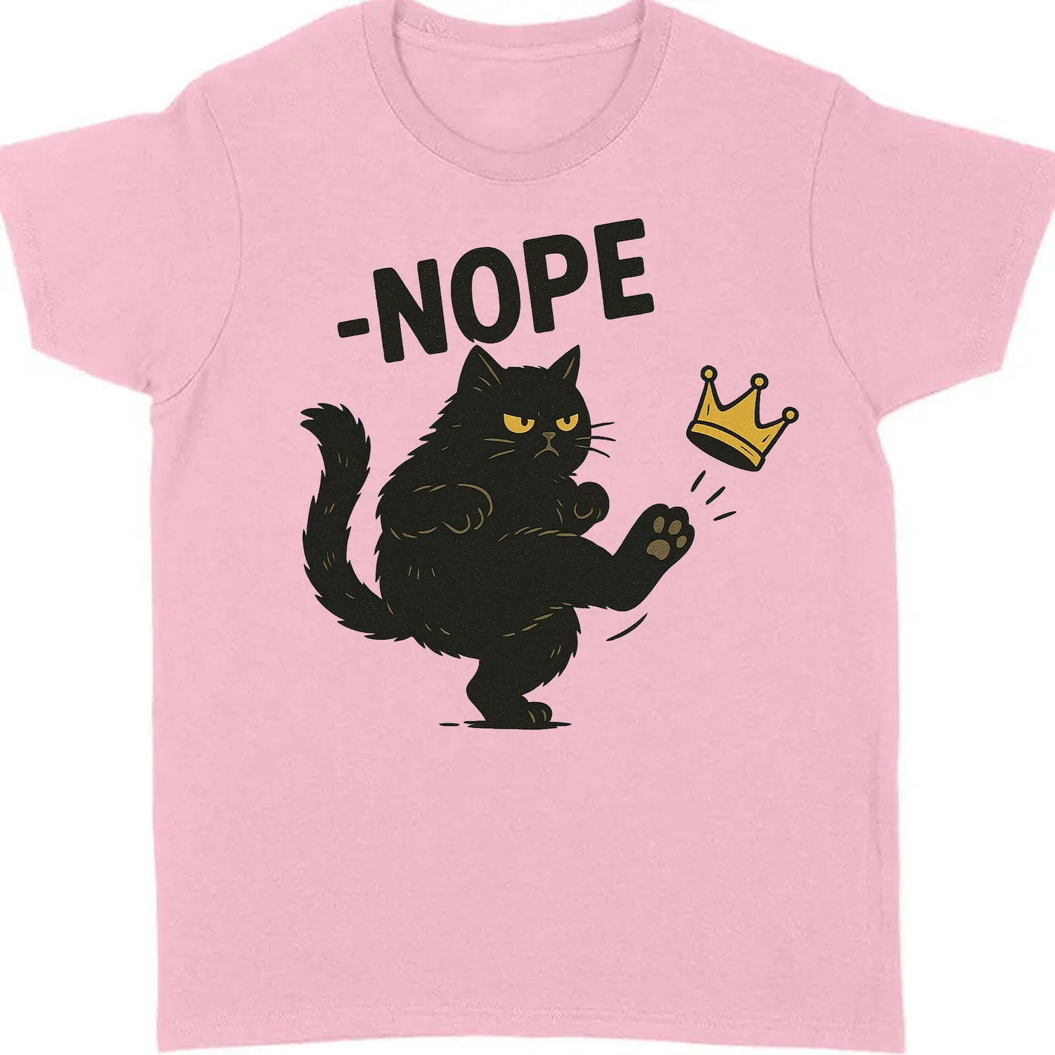 Sweet rebellion meets feline sass in this clever “NOPE” Cat Kicking Crown t-shirt. Featuring a grumpy black cat literally drop-kicking a golden crown, this tee says what many are thinking — with attitude and humor.