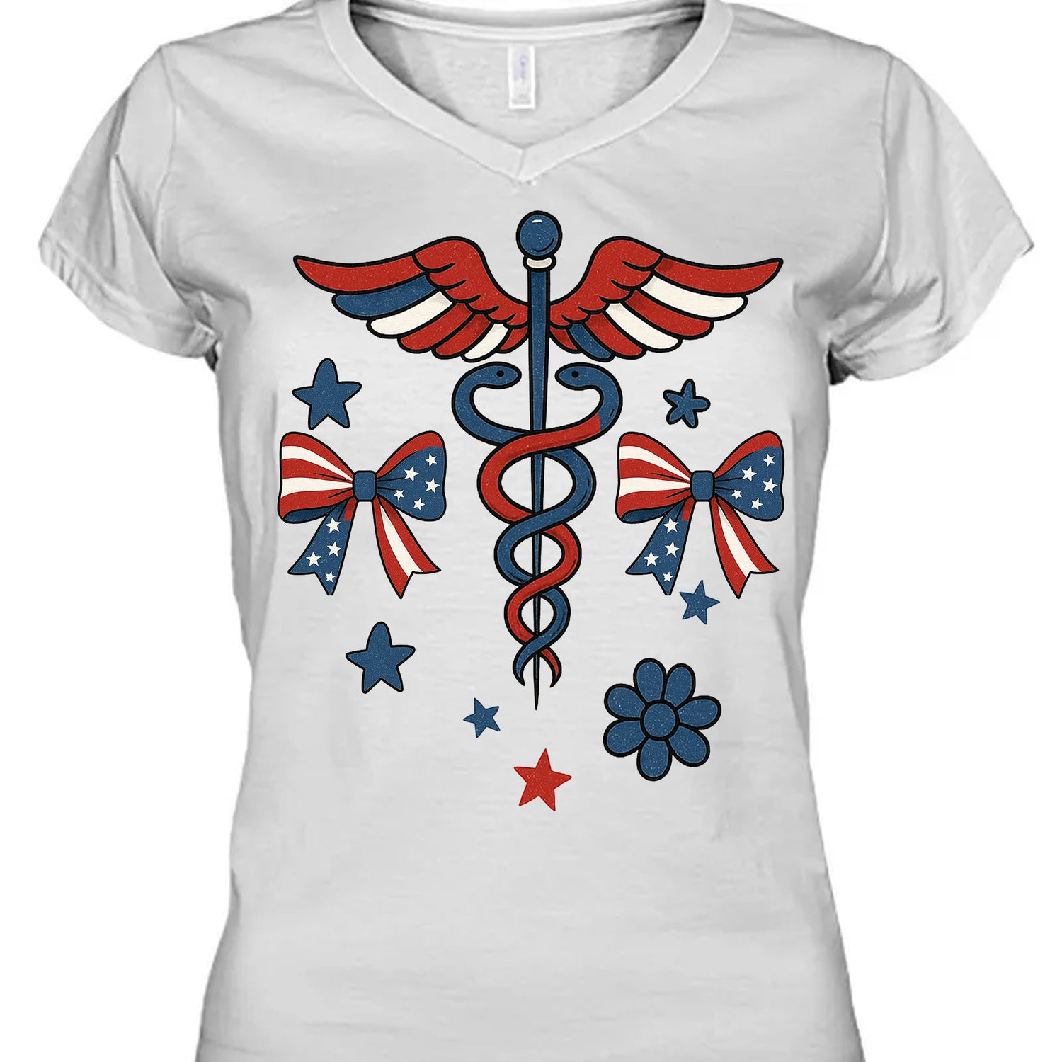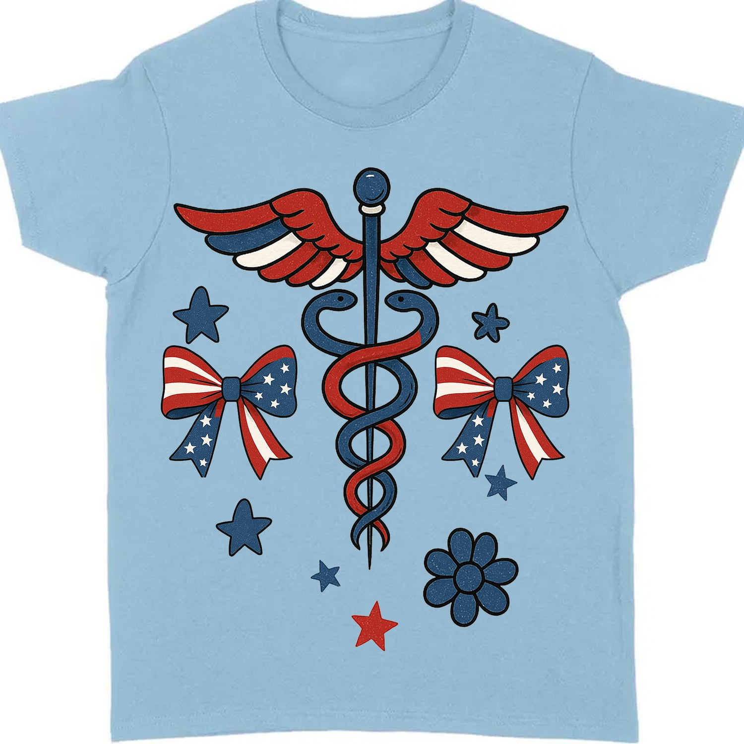Celebrate the strength, compassion, and patriotism of nurses with this Patriotic Nurse T-Shirt featuring the iconic caduceus symbol in a vibrant red, white, and blue design. Centered on the chest, the medical caduceus is paired with festive American flag-themed bows, stars, and flowers—honoring your profession and your love for your country in one bold statement.