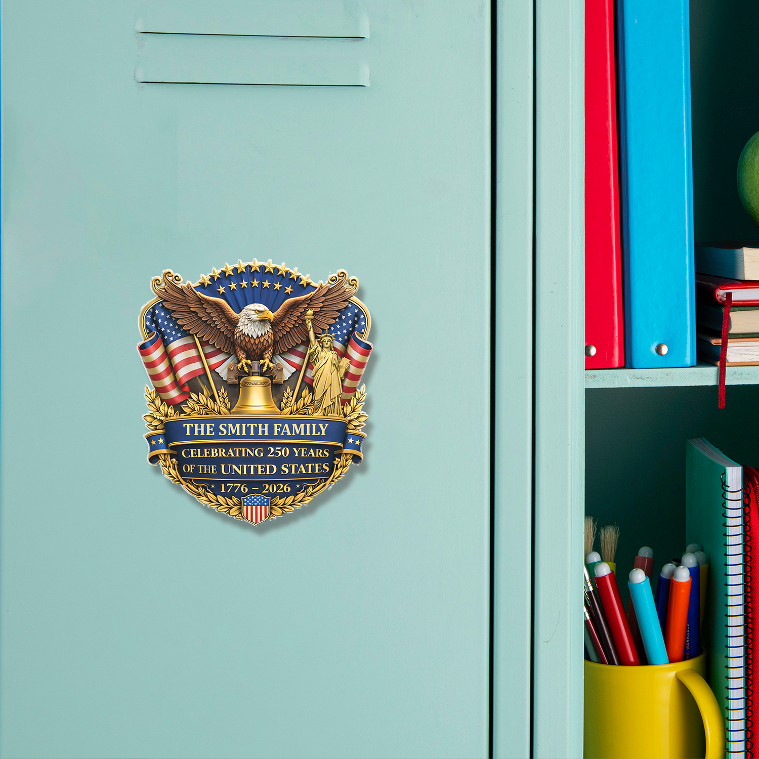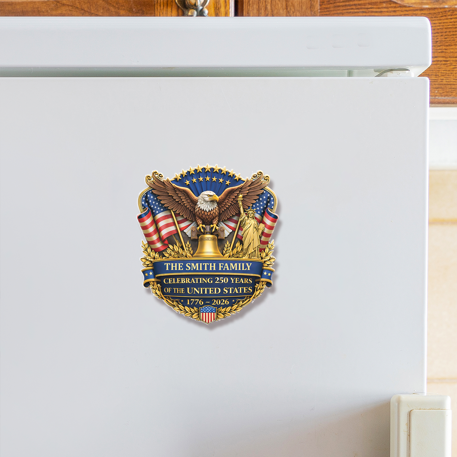 Bring a touch of historic pride right into your kitchen with this personalized, highly detailed fridge ornament. Beautifully crafted to commemorate America's 250th anniversary, this decorative magnetic piece features a stunning collection of national symbols, including a majestic bald eagle, the Statue of Liberty, the Liberty Bell, and vibrant American flags. The intricate design is anchored by custom banners that proudly display your family name alongside the monumental 1776-2026 dates, making it a perfect everyday keepsake to celebrate the Semiquincentennial.