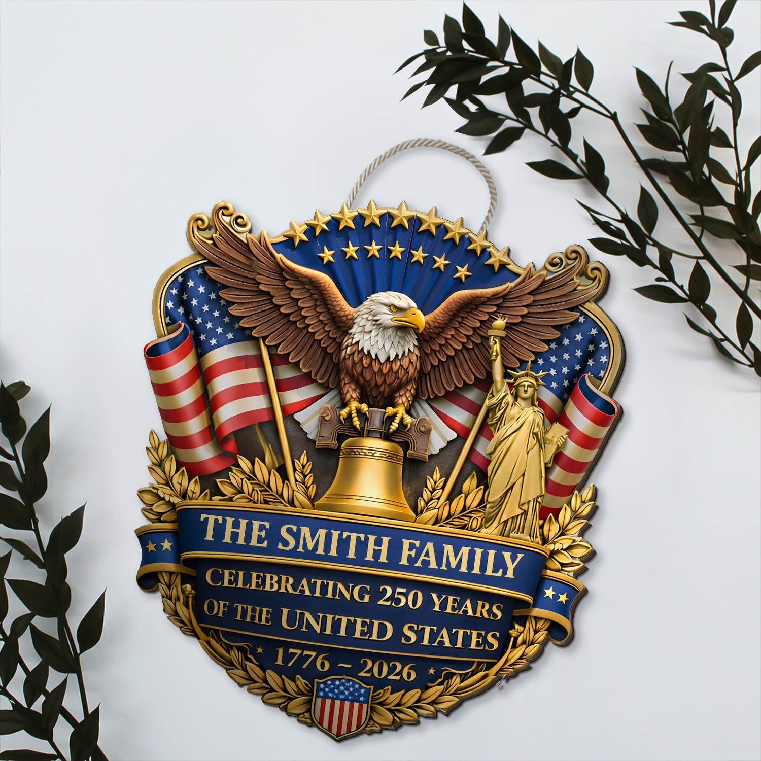 Showcase your family's patriotic pride with this stunning, personalized wooden sign. Designed with intricate, three-dimensional details, this decorative piece beautifully commemorates the nation's 250th anniversary. It features an impressive array of classic American symbols, including a majestic bald eagle, the Statue of Liberty, the Liberty Bell, and vibrant flags, all resting above customizable banners to display your family name alongside the historic 1776-2026 dates. Ready to hang by its attached cord, it makes a striking and welcoming statement for your front door, porch, or entryway.