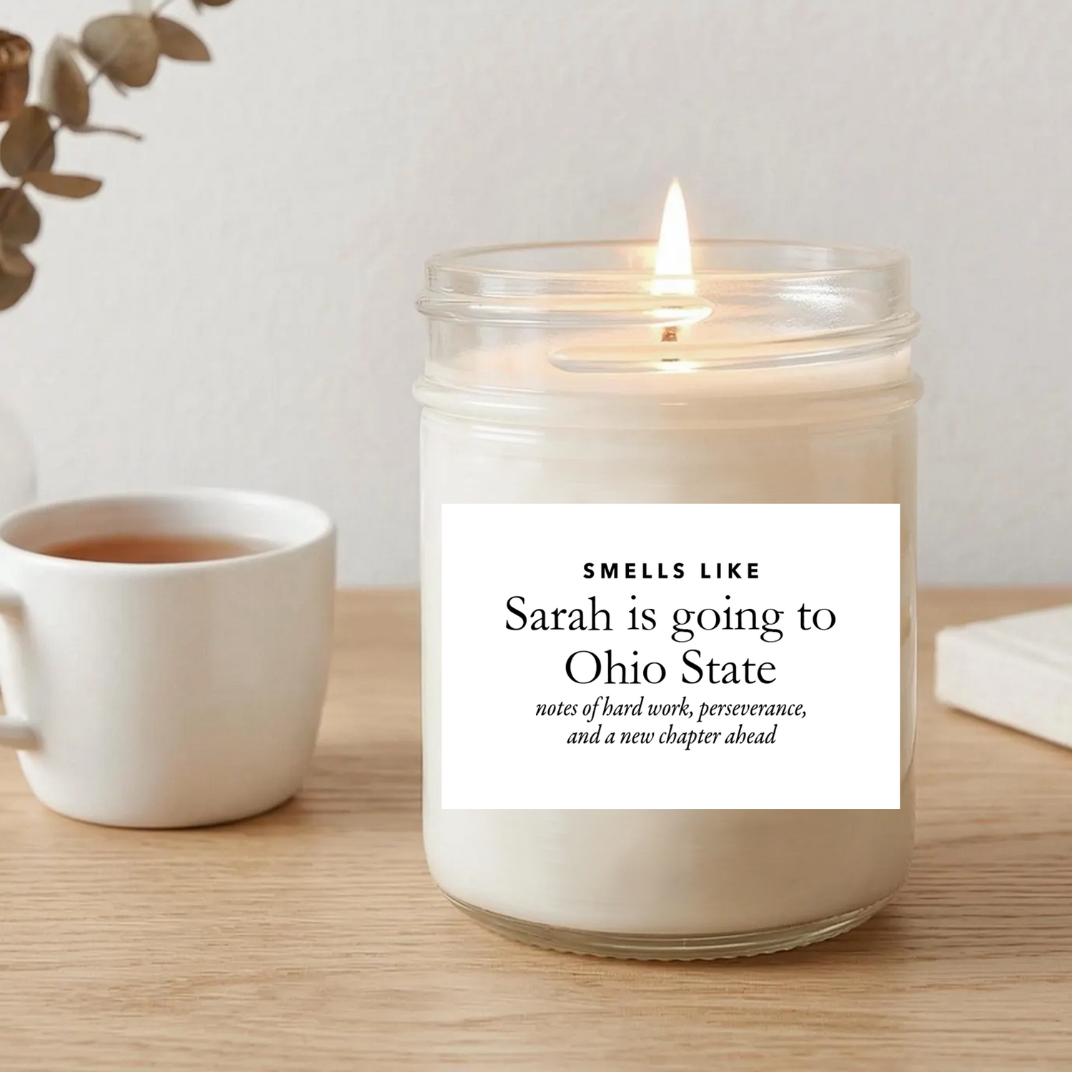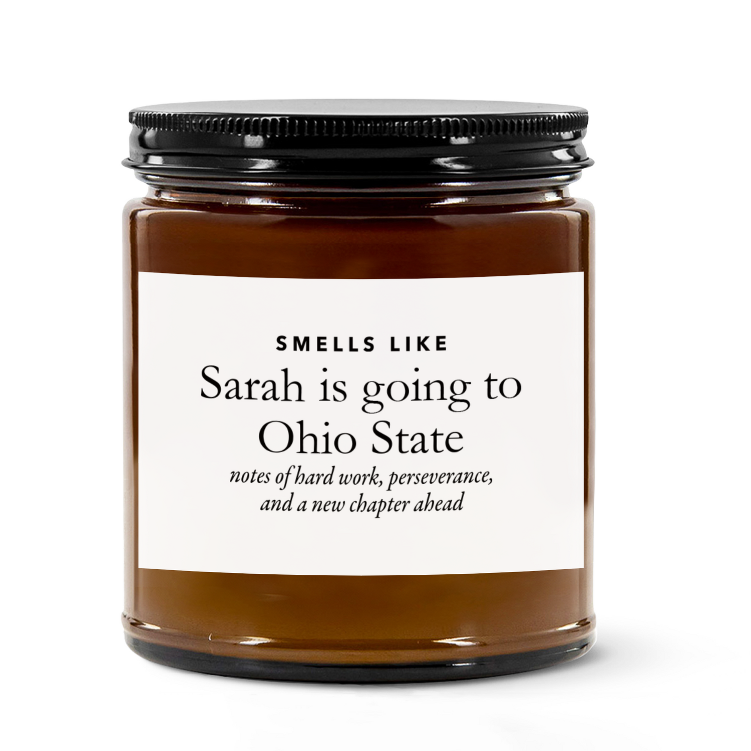 Celebrate a major educational milestone with the perfect graduation gift that captures the excitement of their upcoming journey. This beautifully crafted scent candle features a heartwarming, personalized label that proudly announces the graduate's chosen college, cleverly blending custom text with charming "fragrance notes" of hard work, perseverance, and a new chapter ahead. Made from a high-quality vegan soy wax blend, you can choose between a classic clear jar with a silver lid or a rustic amber glass jar with a black lid to suit their aesthetic. Available in a 4oz size offering 15-20+ hours of burn time or a larger 9oz jar that burns for 40-50+ hours, it is a thoughtful, custom keepsake that will fill their new dorm room with a comforting aroma while serving as a daily reminder of their incredible achievements.