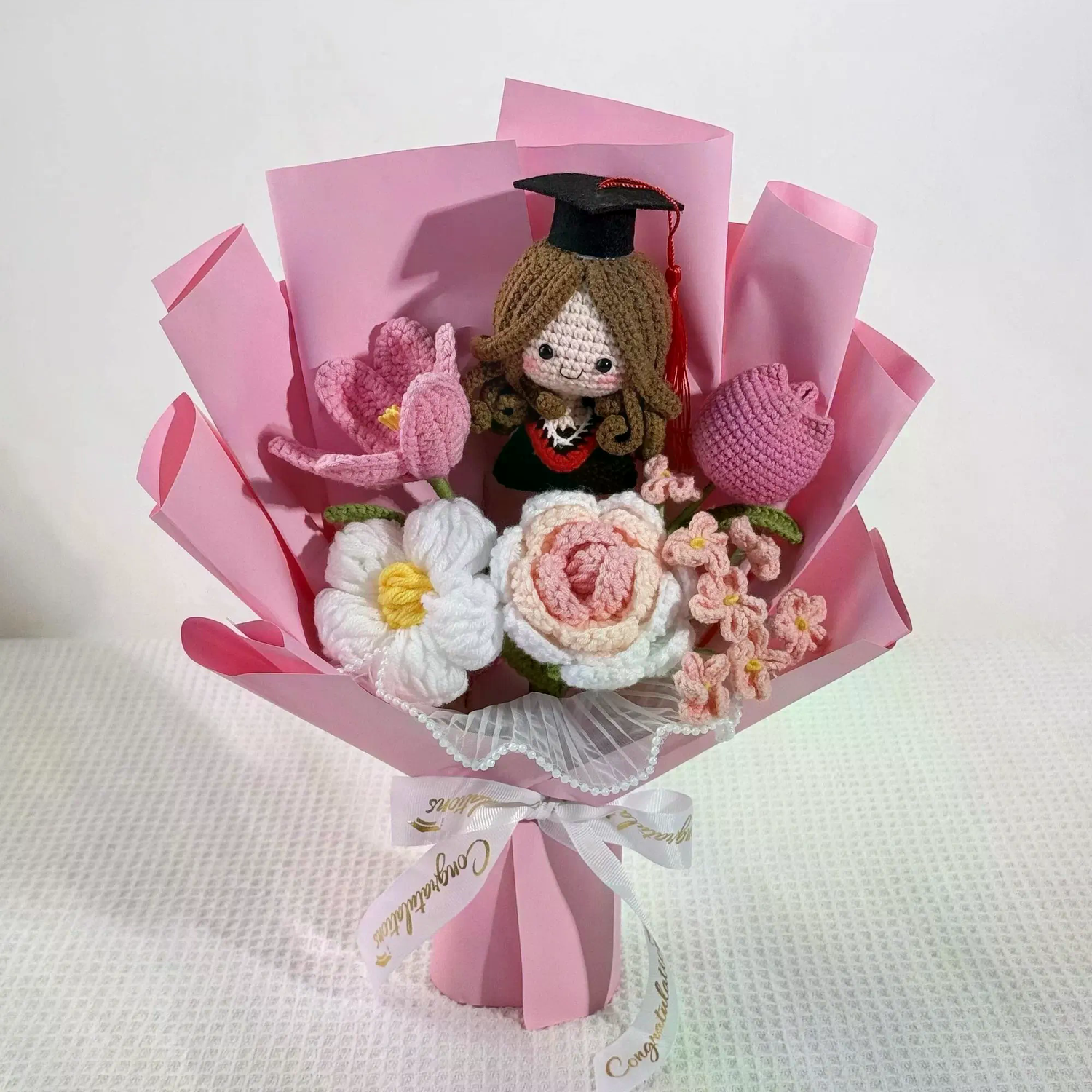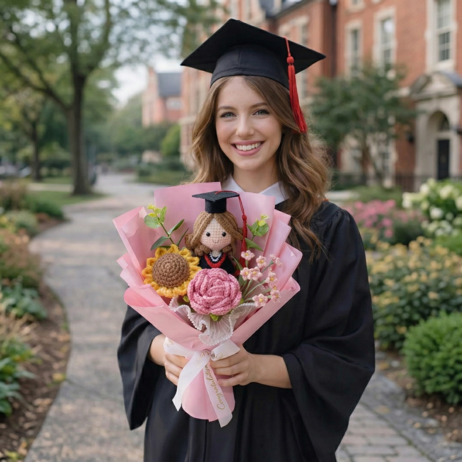 Celebrate their huge academic milestone with an adorable, hand-crafted keepsake they will cherish long after the ceremony ends. This charming crochet bouquet features a meticulously woven doll dressed in traditional graduation attire, complete with a classic black cap, tassel, and academic gown. Surrounded by an array of vibrant, forever-blooming yarn flowers—such as cheerful sunflowers, lush roses, and delicate accent blooms—each arrangement is beautifully wrapped in premium paper and tied with a festive "Congratulations" ribbon. Available in multiple color palettes and floral combinations, it serves as a wonderfully personalized gift, providing a unique, photo-ready tribute to honor the proud graduate's hard work and sweet success.