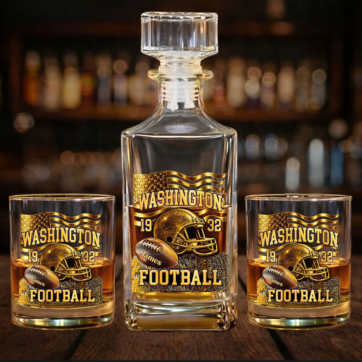 This personalized Washington Football 1932 whiskey decanter set is a timeless tribute to classic football history and team pride. Featuring a custom name design, the set includes a football-themed whiskey bottle and matching glass, making it a standout addition to any home bar or display. Perfect for football fans, collectors, or special occasions, this decanter set combines nostalgia with personalization, creating a meaningful gift for those who appreciate the legacy of Washington football and enjoy celebrating it with their favorite drink.