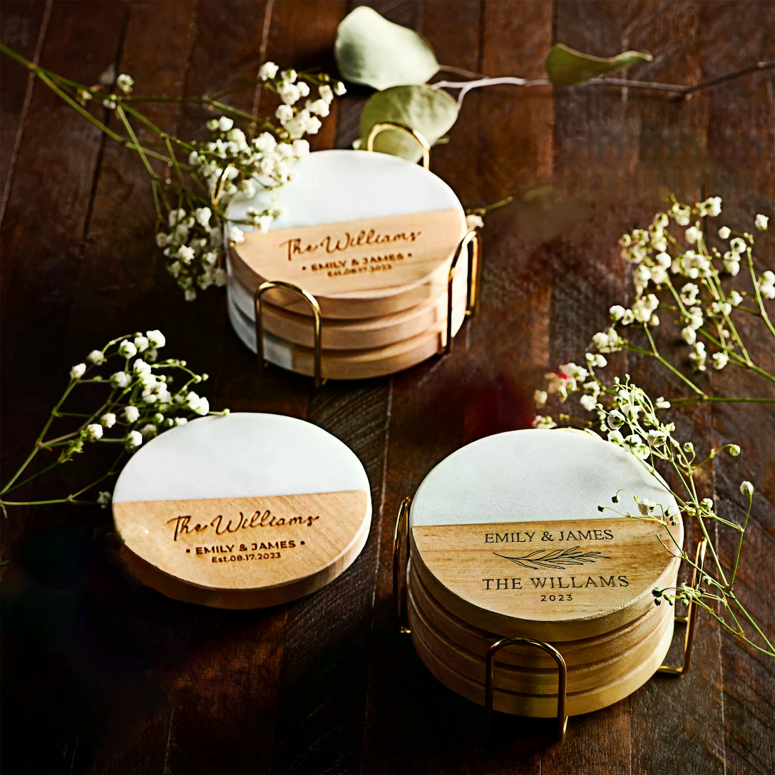 Celebrate a beautiful wedding or anniversary with a customized gift that perfectly blends rustic charm and modern elegance. This stunning set features a split design crafted from real white marble and natural smooth wood, offering a luxurious and durable upgrade from a standard ceramic coaster. Thoughtfully personalized with gracefully engraved names, elegant leafy motifs, and special establishment dates, these beautiful drink rests make an ideal, stylish keepsake for couples starting their new life together. Complete with a sleek gold metal holder for easy storage and equipped with protective rubber grips underneath to keep your surfaces safe, this sophisticated tabletop accessory is both highly functional and a timeless reminder of their most cherished milestone.
