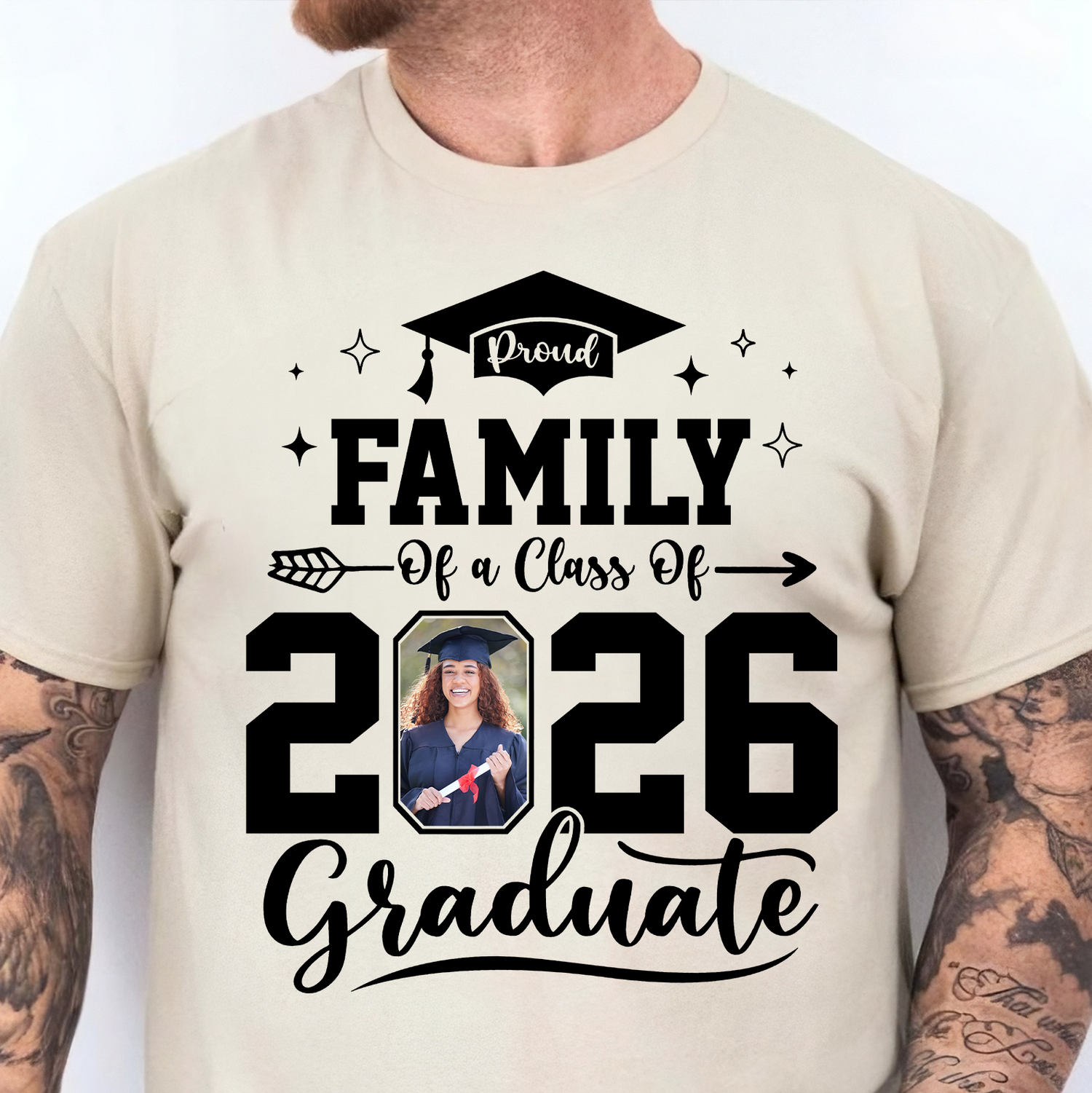 Celebrate your loved one's milestone with this custom commemorative apparel. This bright shirt features a bold, black graphic reading "Proud FAMILY Of a Class Of 2026 Graduate," complete with a graduation cap motif, decorative stars, and arrow accents. The standout feature is a central hexagon-shaped photo frame where you can showcase a personalized picture of your graduate. It's a fun, memorable, and highly personalized way to show your support for graduation day events, family parties, and photo ops.