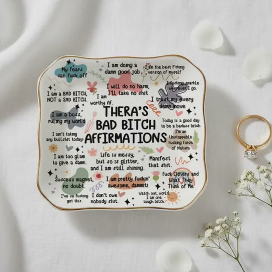 Add a bold and empowering touch to your space with this Swear Affirmations Ring Dish, a fun and meaningful accessory designed to keep your jewelry safe while lifting your mood. Featuring playful, unapologetic affirmations and the option to personalize with a custom name, this trinket tray is both stylish and full of personality. Perfect for holding rings, earrings, and small keepsakes, it’s crafted from high-quality ceramic with a smooth finish and elegant gold trim. Whether placed on a vanity, nightstand, or desk, it serves as a daily reminder of confidence and self-love. A unique and humorous gift for Mother’s Day, birthdays, or best friends, this custom jewelry tray is the perfect mix of sass, style, and sentiment.