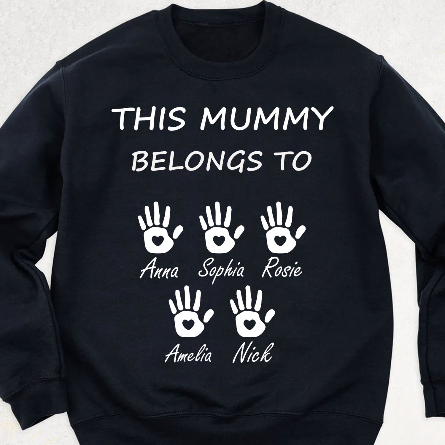 Celebrate the love of a mother with this customizable sweatshirt, featuring the heartfelt quote "This Mummy Belongs To" at the top. Below the quote, adorable kid handprints (1 to 8) represent each child, with their names customized just for you! This cozy and stylish sweatshirt is the perfect Mother’s Day gift for moms, wives, and grandmothers—reminding them of their little ones every time they wear it.